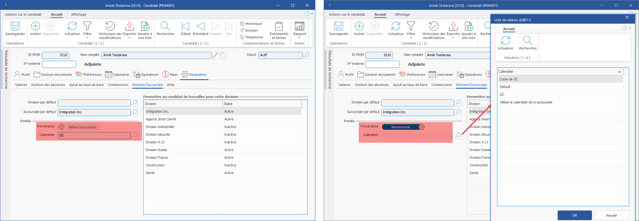 Enfin, dans le dossier des candidats, le calendrier de la succursale par défaut du candidat sera le calendrier considéré par défaut. Toutefois, il sera possible de sélectionner un autre calendrier parmi les calendriers existants. (voir Image)