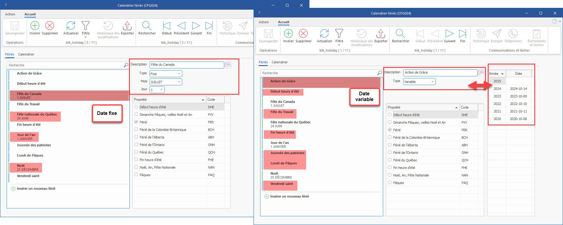 5.Refonte du calendrier des fériés : Il existe maintenant deux types de fériés : fixe (date fixe, la date demeure la même d'une année à l'autre) ou variable (la date n'étant pas la même, elle doit être indiquée chaque année). (Voir image)