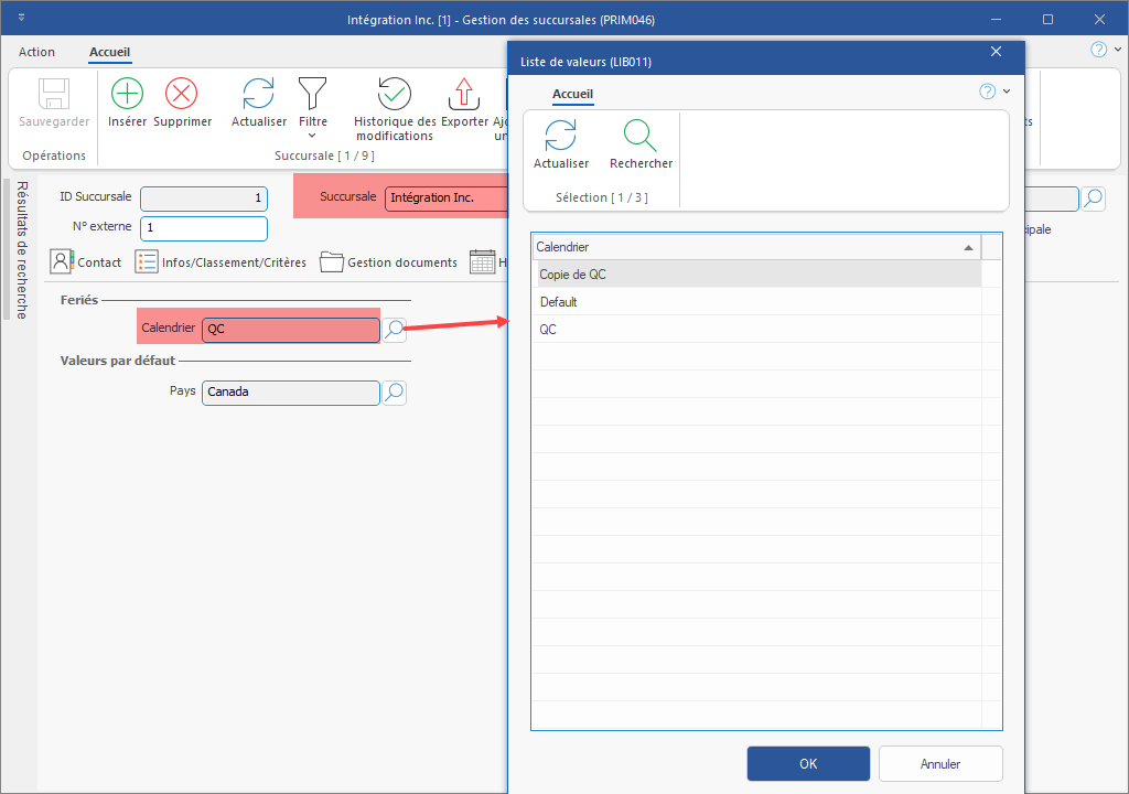 Par ailleurs, un calendrier de fériés doit maintenant être indiqué dans les paramètres de la succursale. (voir image)