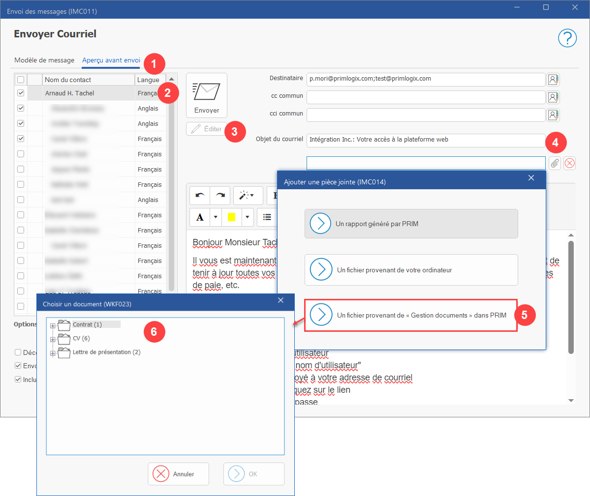 27.Courriels et pièces jointes : Il est maintenant possible de joindre les fichiers provenant de Gestion documents dans le dossier du destinataire du courriel. Pour ce faire, il faut éditer le message et ajouter la pièce jointe pour le destinataire concerné dans l'onglet Aperçu avant envoi. (Voir image)