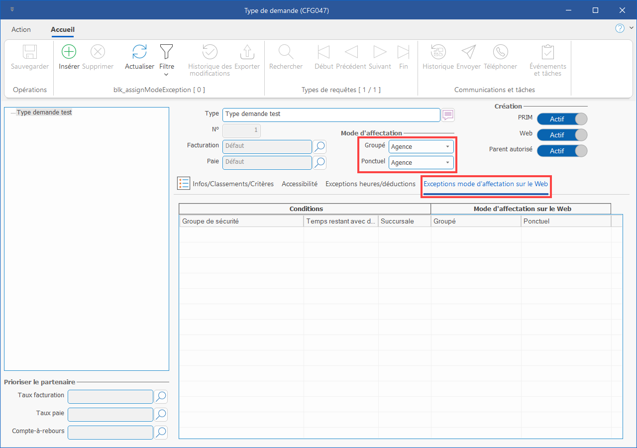 4.Modes d'affectation : Nouvelles règles d'exception pour le mode d'affectation des demandes ponctuelles ou de quarts groupés, permettant de modifier le mode d'affectation selon certaines conditions, notamment si la succursale est fermée. (Voir image)