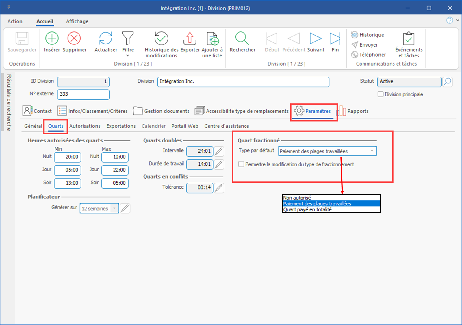 Action client : Pour chaque division, déterminer si les quarts fractionnés sont autorisés, le type de fractionnement, et s’il est possible de modifier le type de fractionnement. (Voir image)