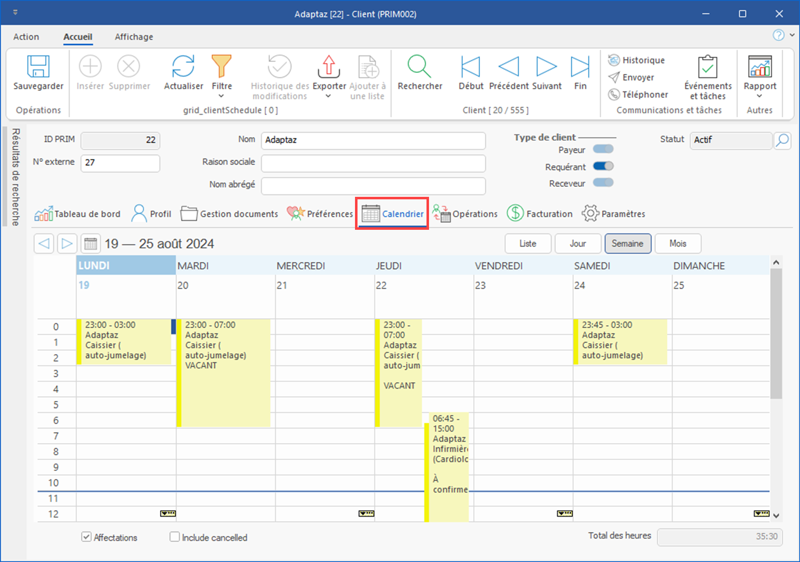 5.Fenêtre client : Ajout d’un onglet Calendrier dans la fenêtre client, avec un fonctionnement similaire à celui de la fenêtre candidat. (Voir image)