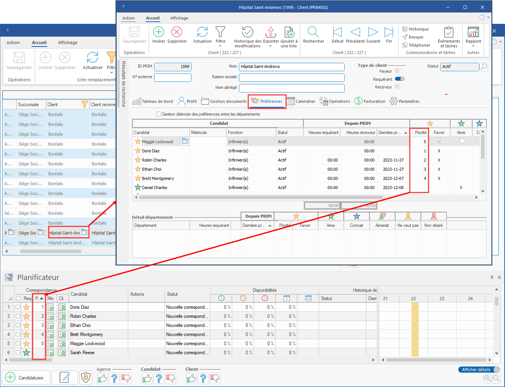 6.Planificateur : Ajout d’une colonne pour afficher la priorité des candidats selon les préférences du client. Le numéro associé à la priorité indiqué dans les préférences du client s’affiche maintenant dans le planificateur et il est possible de trier selon la priorité. (Voir image)