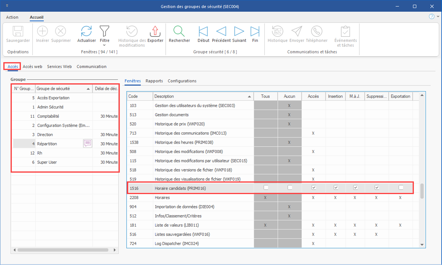 Action client : Vérifier que les groupes de sécurité pertinents ont accès à la fenêtre Horaires candidats (PRIM 016). (Voir image)
