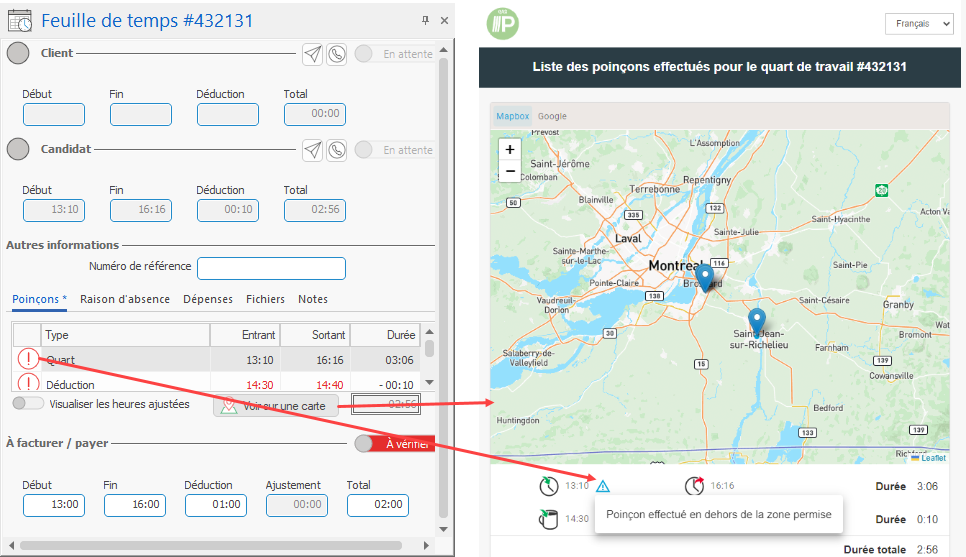 12.Poinçons hors zone : L'avertissement ajouté aux poinçons signalés comme hors zone dans la feuille de temps est maintenant également affiché à côté de ces poinçons lorsqu'ils sont affichés sur la carte, que ce soit à partir de la feuille de temps ou du portail Web. (voir image)