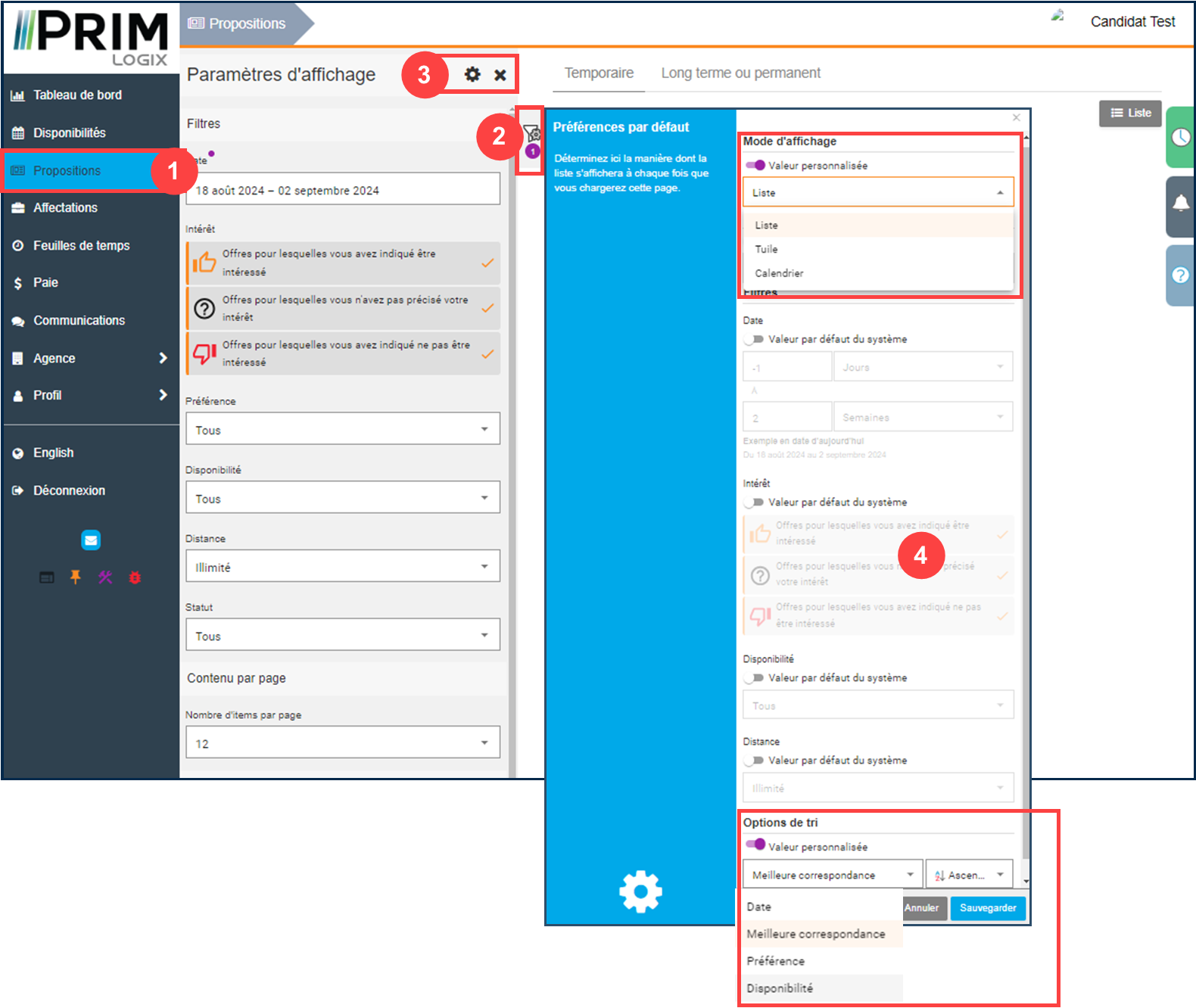 9.Portail Web et affichage et tris par défaut : Ajout d’un tri et d’un mode d’affichage par défaut (liste ou tuile) dans les préférences utilisateur dans différentes pages du portail candidat et du portail client. (Voir image préférences utilisateur candidat, page Proposition)