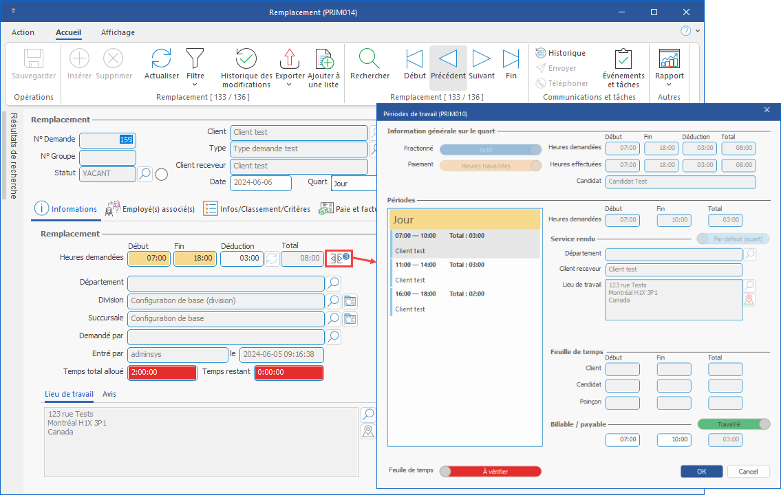 1.Quarts fractionnés : Possibilité de créer des quarts fractionnés, c’est-à-dire des affectations composées de plusieurs périodes de travail entrecoupées par des pauses au cours d’une même journée. À cet effet, une nouvelle fenêtre (PRIM010), a également été créée afin de permettre de voir ou modifier les périodes de travail incluses dans le quart fractionné. Cette fenêtre est accessible au moment de la création dans l'ajout en lot, dans la fenêtre Quarts (PRIM014), ainsi que dans les modèles de demandes. Le bouton permet d'y accéder, et une pastille sur ce bouton indique le nombre de périodes de travail. (Voir image)
