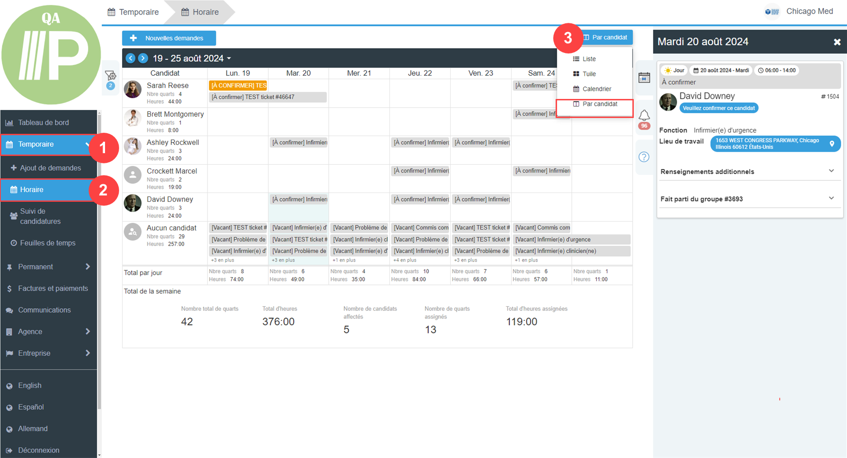 8.Portail Web client : Nouveau mode d’affichage des demandes par candidat, permettant d’afficher l’horaire des quarts par candidat sous forme de grille. Ce mode d’affichage est disponible dans la nouvelle page Horaires du portail Web client, qui permet de voir toutes les demandes en cours, à venir ou passées. Il suffit de sélectionner un quart pour en voir les détails sur le volet de droite. (Voir image)