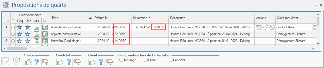 10.Volet Proposition de quarts : Pour les quarts faisant partie d'un horaire d'unee demande groupée, les colonnes Débute le et Se termine le affichent maitenant l'heure en plus de la date. À noter que le champ Se termine le n'affiche toutefois des données que si une date de fin existe pour l'horaire concerné. (Voir image)