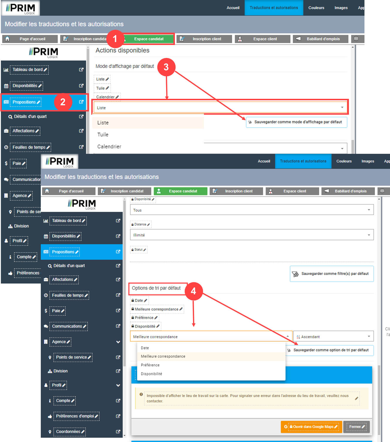 Action client : A partir du back office, vérifier et modifier au besoin le Mode d’affichage par défaut (liste, tuile et possiblement calendrier) et les Options de tri par défaut dans les pages suivantes :