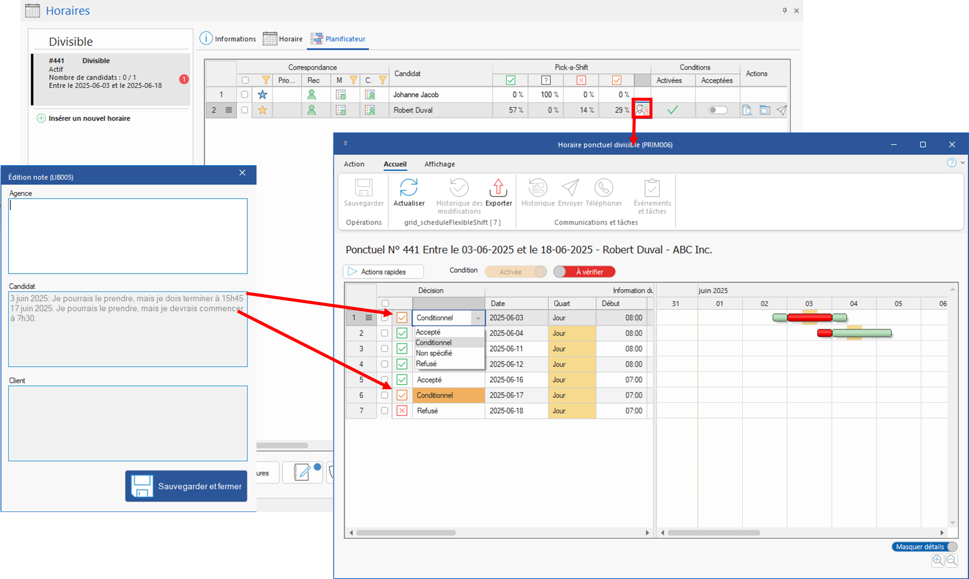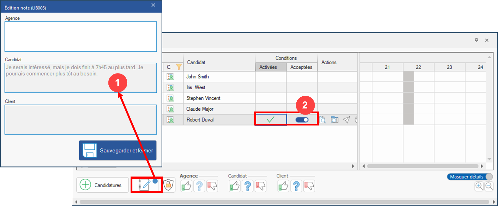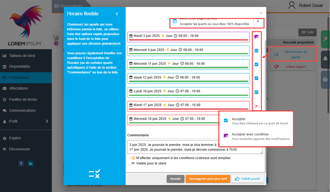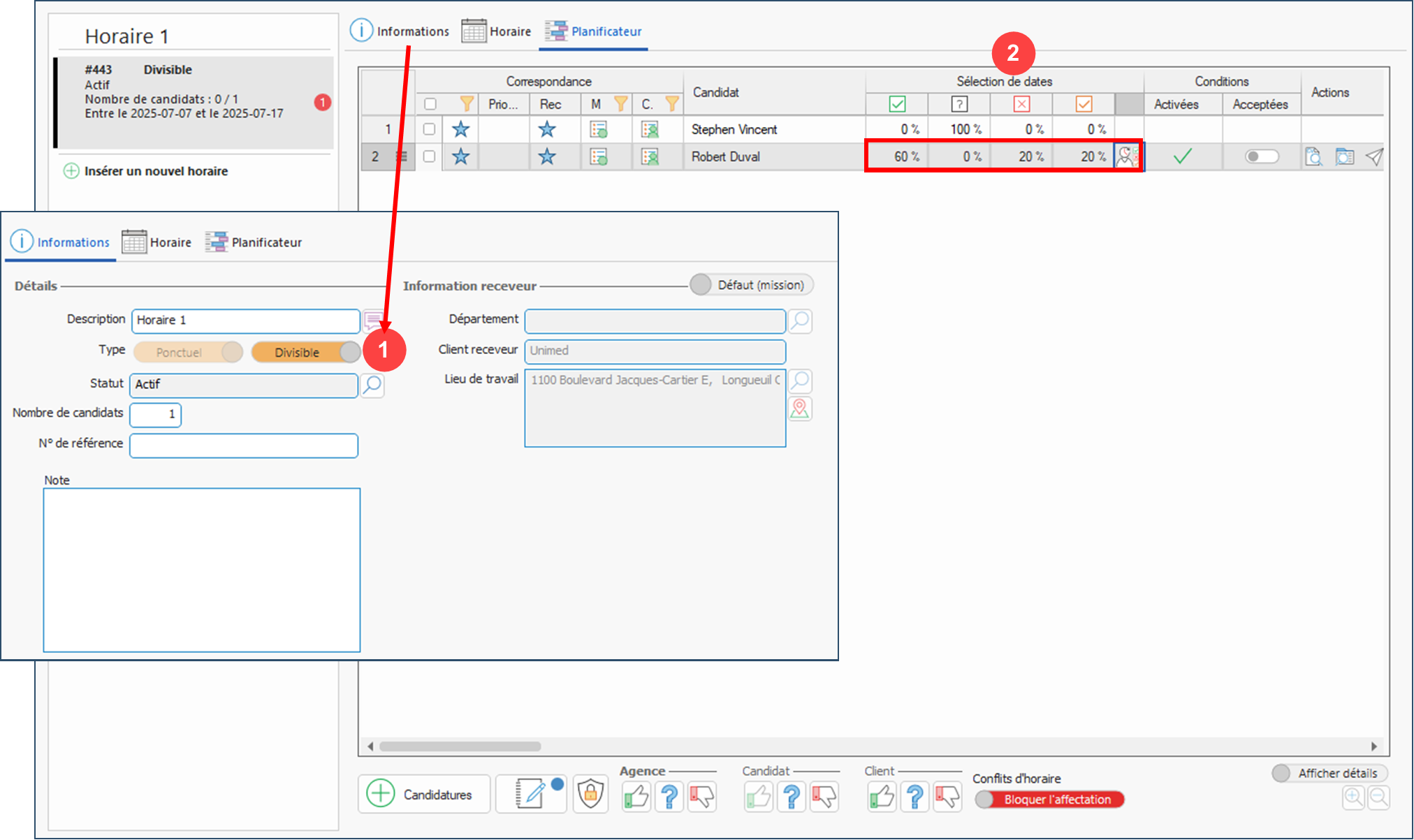 Lorsque ce mode est activé sur un horaire (1), des colonnes sont ajoutées au planificateur, indiquant le pourcentage de quarts acceptés, acceptés avec conditions ou refusés, ainsi que le bouton pour accepter ou refuser les conditions (2). (Voir image)