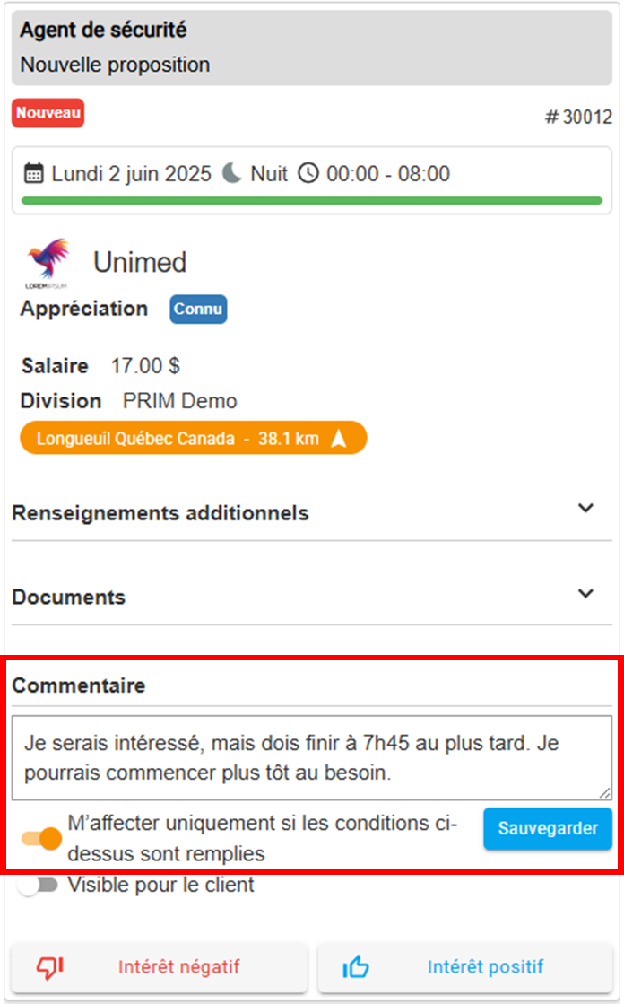 2.Portail Web candidat et ajout de conditions pour demandes temporaires : Une nouvelle fonctionnalité offre la possibilité d'ajouter des conditions à l'acceptation d'une affectation. Les candidats peuvent désormais préciser leurs attentes ou restrictions dans une note et activer un interrupteur pour indiquer que cette note constitue une condition indispensable à leur acceptation de l'affectation. (Voir image)