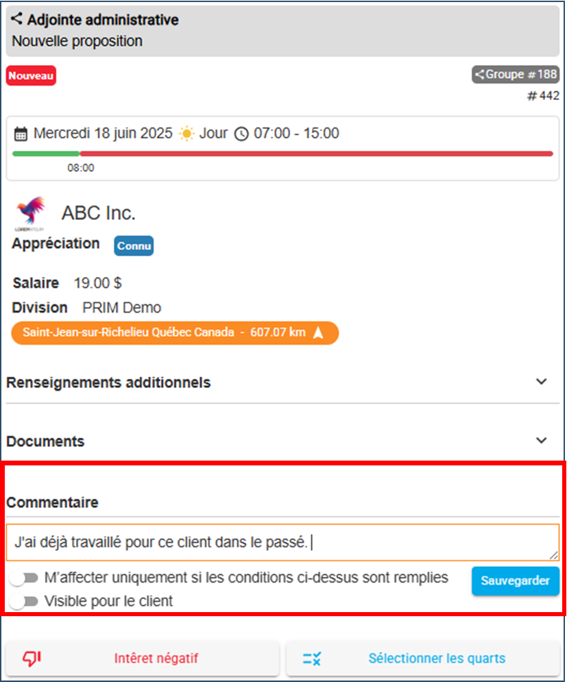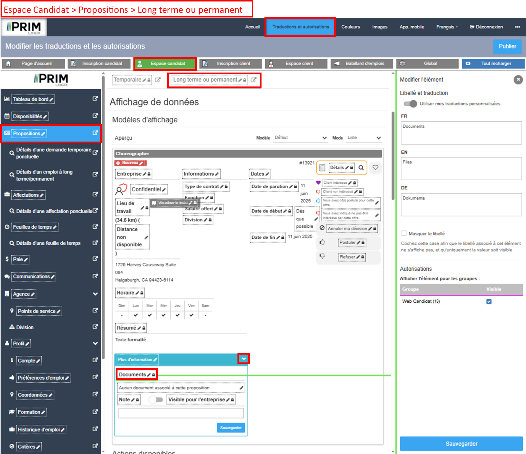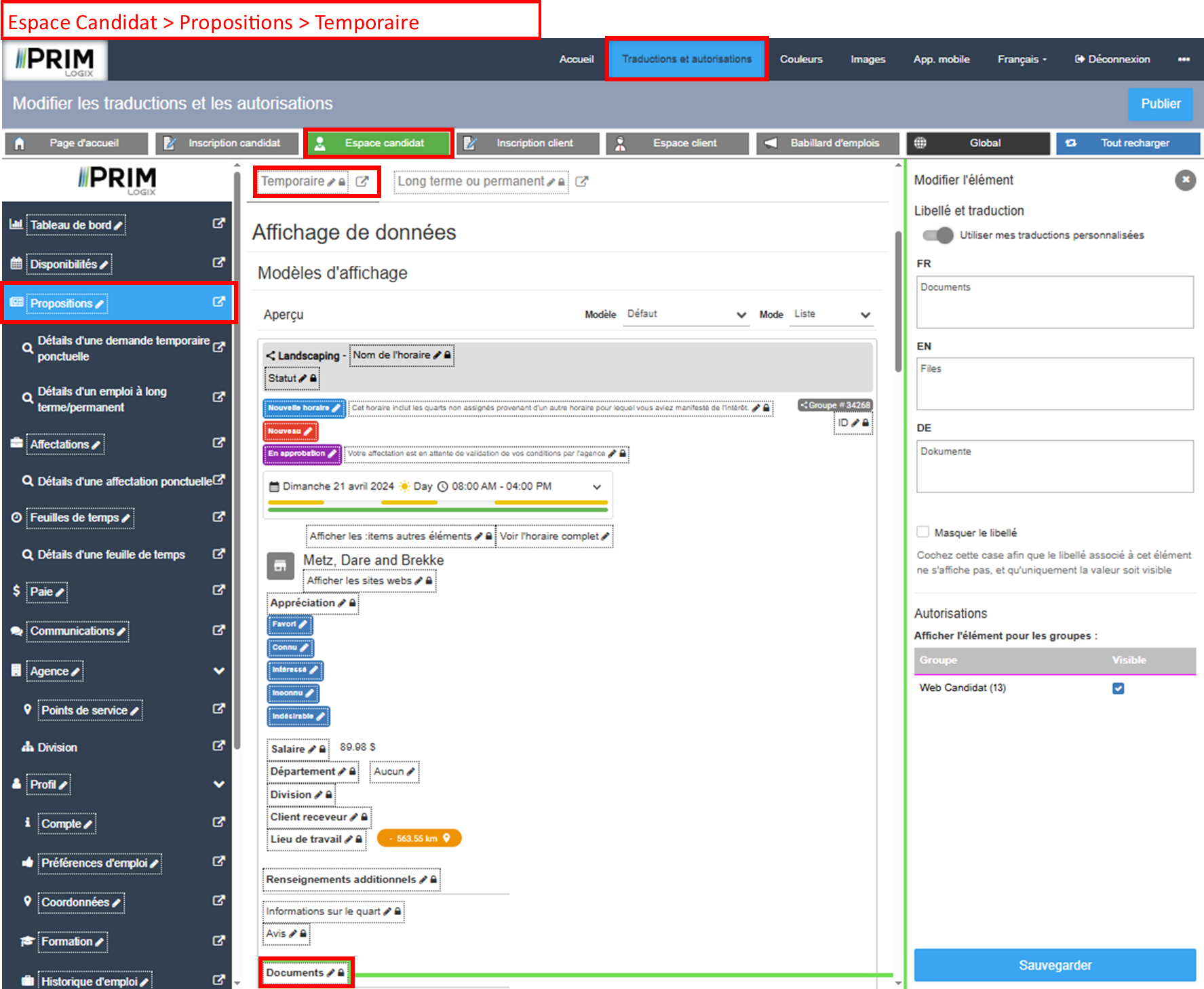 6.Documents associés aux demandes et affichage Web : Il est maintenant possible d'afficher les documents liés à une demande sur les tuiles des propositions ou des affectations sur le portail Web candidat. Les documents provenant des entités suivantes pourront être affichés, sous réserve qu'ils respectent les modalités d'affichage : division, succursale, client requérant ou client receveur, quart, type de demande (CFG047) demandes groupées (mission), poste.