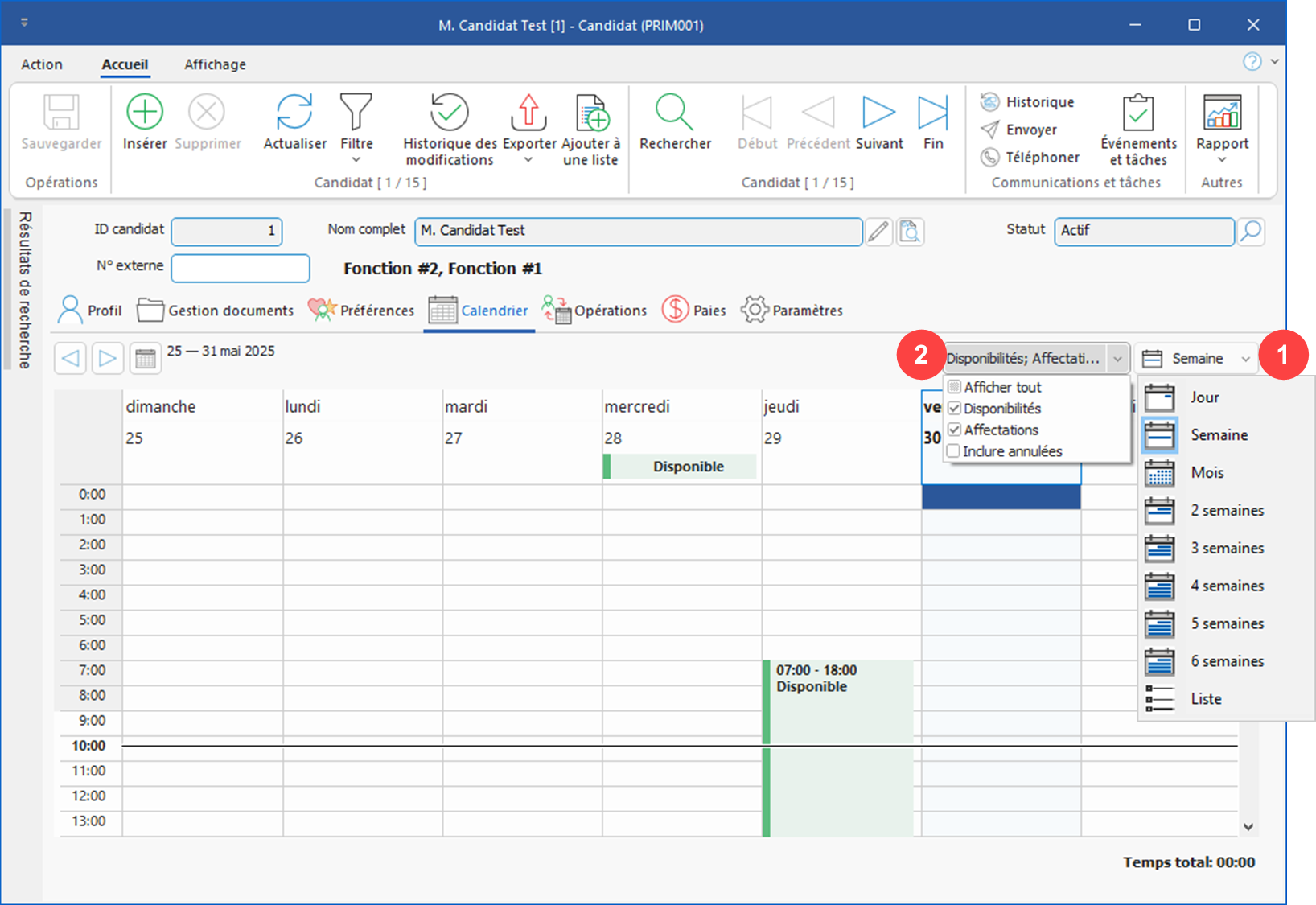 7.Calendriers et menus d'affichage : Dans les diverses fenêtres proposant des vues de type calendrier ou liste (par exemple, onglet Calendrier des fenêtres Candidat et client, ainsi que le volet Opérations et les horaires ponctuels des demandes groupées), un nouveau menu déroulant a été ajouté pour sélectionner l'affichage (1). Ce menu offre les options suivantes :