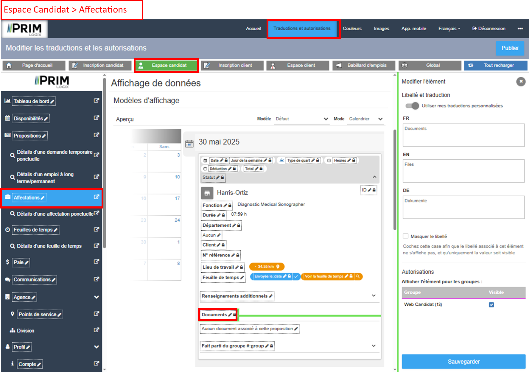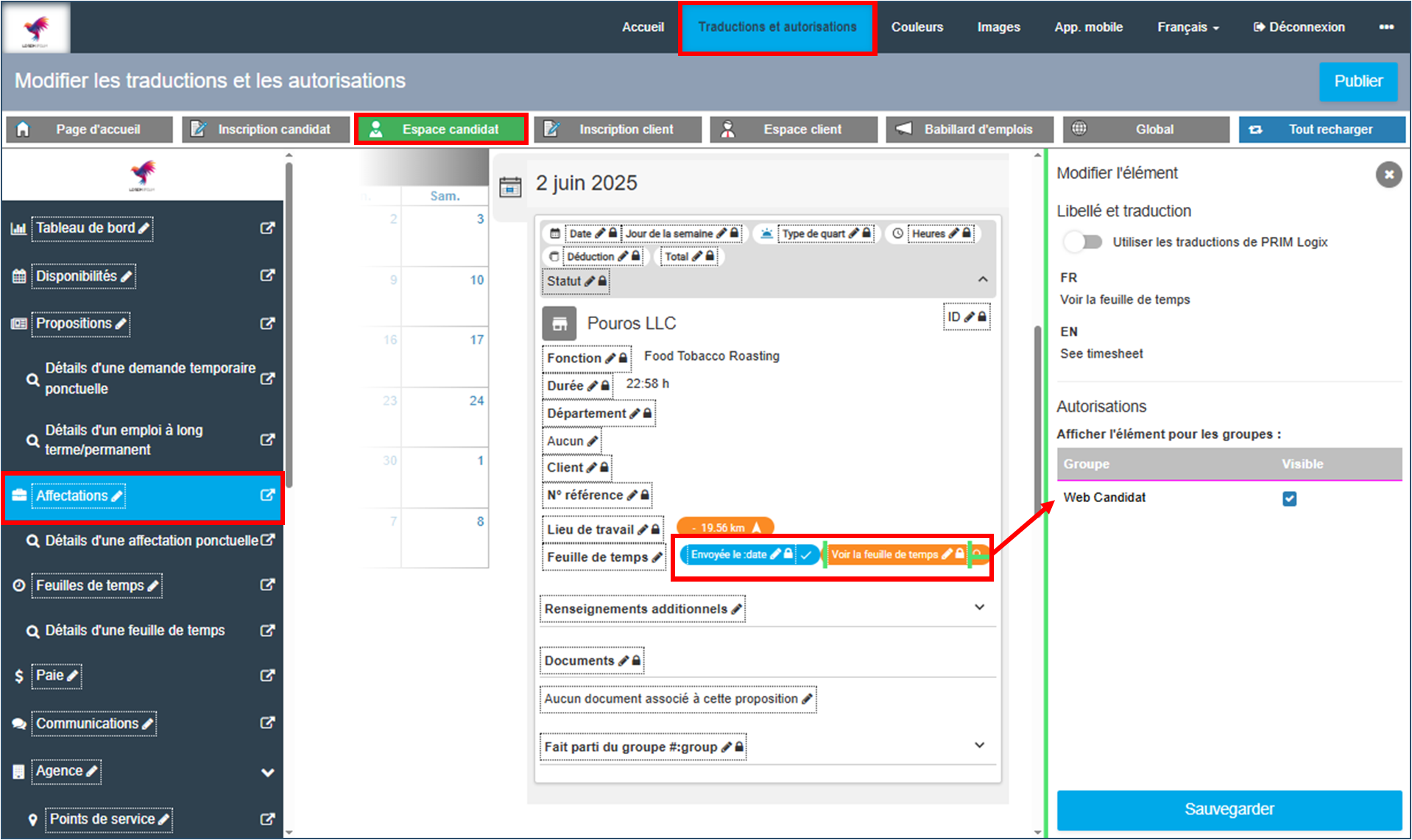 17.Backoffice - Candidat / Affectations : Une nouvelle sécurité a été ajoutée sur la page des affectations de l'espace candidat, permettant de masquer ou d'afficher les données et de permettre d'accéder à la feuille de temps à partir de la tuile de cette page.