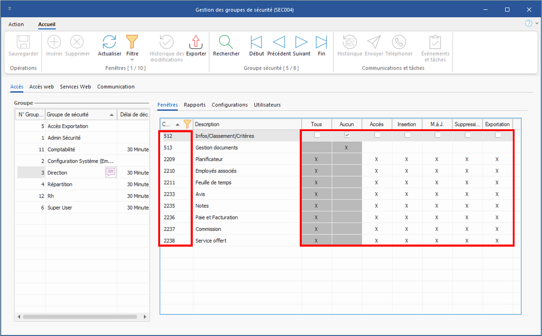 - Si vos groupes de sécurité diffèrent de ceux de la configuration de base, vérifier que les utilisateurs de ces groupes ont accès aux nouveaux volets.
