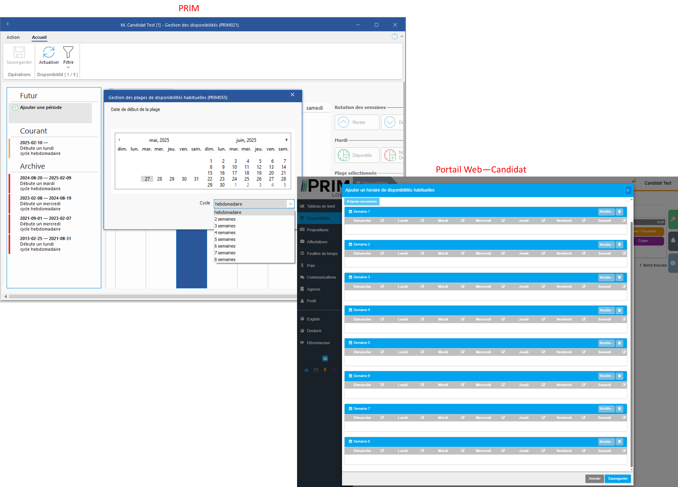 24.Candidat - Disponibilités habituelles : Permettre l'utilisation d'un cycle de jusqu'à 8 semaines pour les disponibilités habituelles d'un candidat. (Voir image)