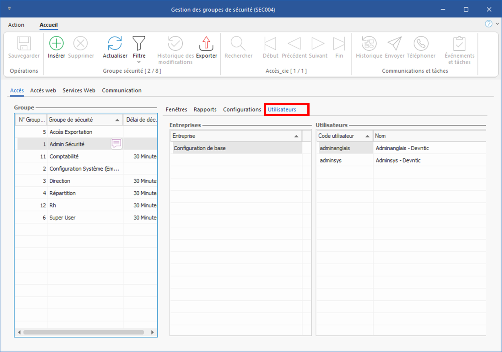 9.Groupes de sécurité et utilisateurs : Un nouvel onglet Utilisateurs a été ajouté dans la fenêtre Gestion des groupes de sécurité (SEC004). Cet onglet permet de visualiser rapidement tous les utilisateurs associés à un groupe de sécurité pour chaque entreprise, mais également d'ajouter ou de retirer des utilisateurs d'un groupe de sécurité. (Voir image)