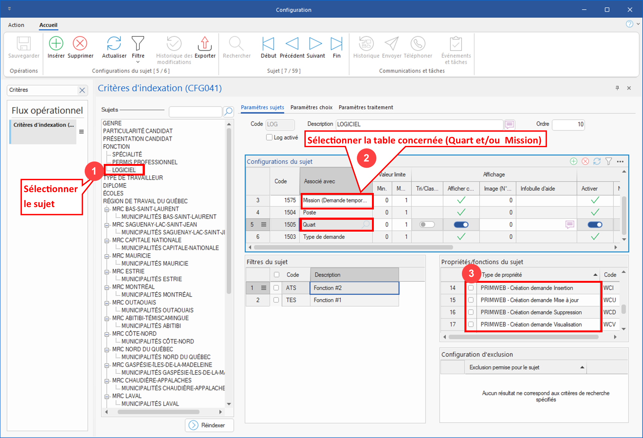Action client : Pour qu'un critère soit visible sur le Web, qu'ils soit associé au type de demande ou simplement disponible en recherche , les propriétés du sujet relatives à l'affichage Web doivent être cochées dans le volet Critères d'indexation de la fenêtre de configuration dans les tables Quart et Mission. (Voir image)