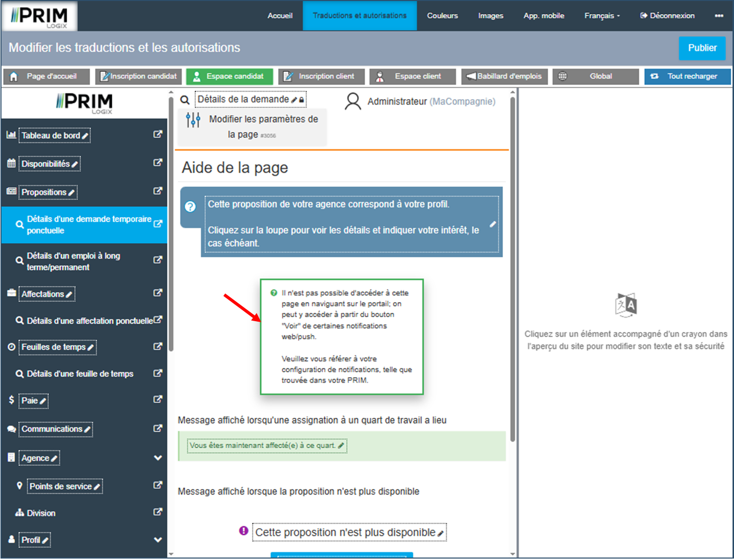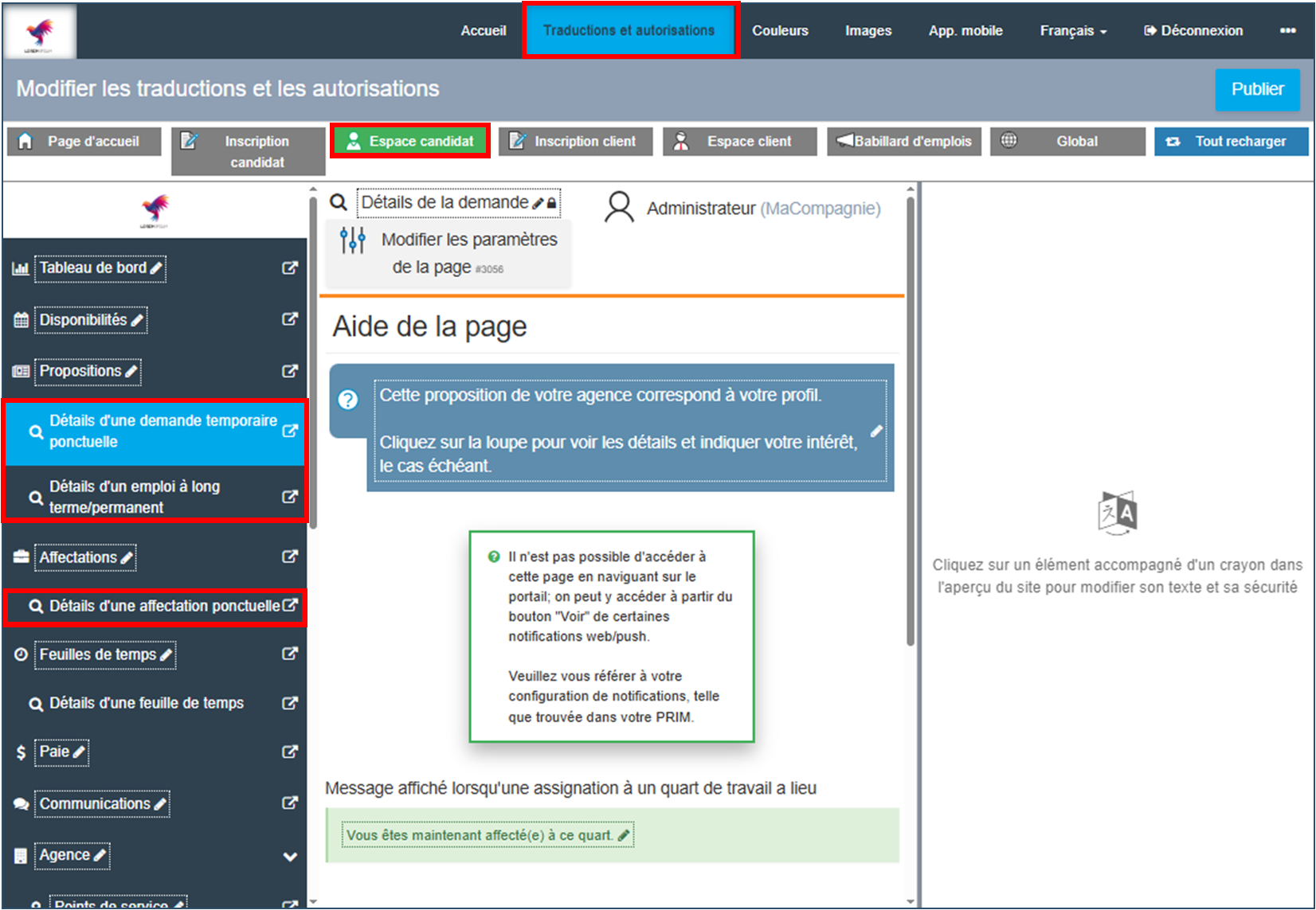 20.Backoffice : Introduction de textes d'aide pour les utilisateurs/gestionnaires du backoffice dans la section Traductions et autorisations. Ces textes sont facilement identifiables, puisqu'ils se retrouvent dans un encadré vert (Voir image)