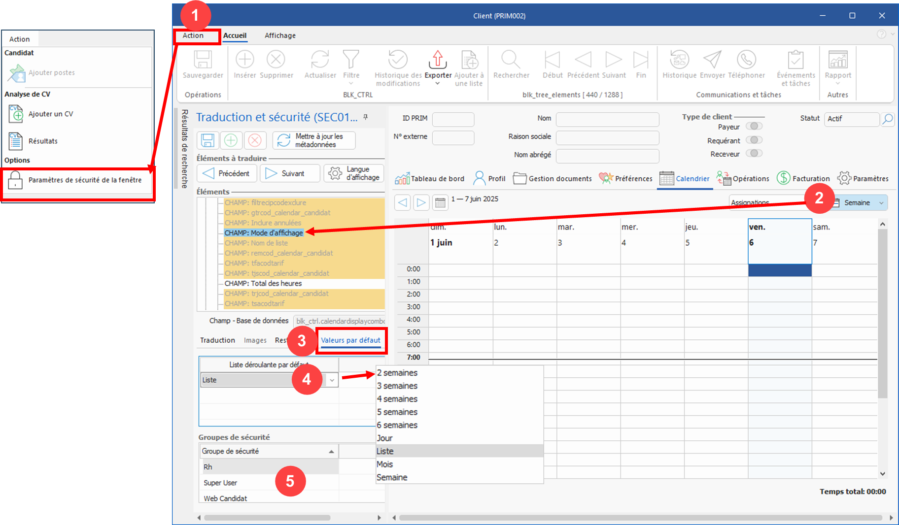 8.Vues « Calendrier/Liste » et mode d'affichage par défaut : Il est maintenant possible de préciser un mode d'affichage par défaut selon le groupe de sécurité dans les divers emplacements avec ces types d'affichage : onglet Calendrier des fenêtres Candidat et Client, volet Opérations et horaires ponctuels des demandes groupées, fenêtres Tâches à effectuer (WKF004) et Gestion des événements et tâches (WKF011). Au besoin, demandez l'aide de notre équipe. (Voir image)