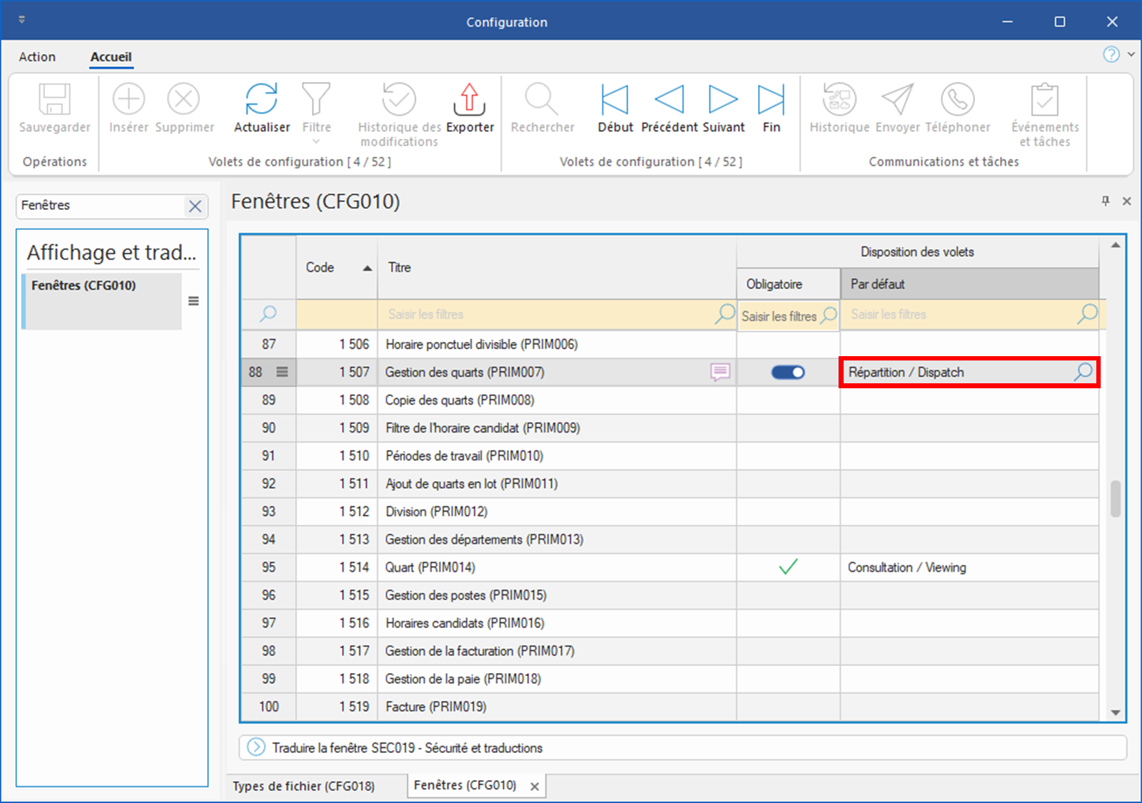 10.Fenêtre de configuration/ Volet « Fenêtres (CFG010) » : Ce volet répertorie les principales fenêtres de PRIM. Une section a été ajoutée pour permettre de définir une disposition par défaut, laquelle sera utilisée si aucune autre disposition n'est appliquée pour un groupe de sécurité ou un utilisateur. De plus, la colonne Obligatoire indique si une disposition est recommandée pour une utilisation optimale dans certaines fenêtres. (Voir image)