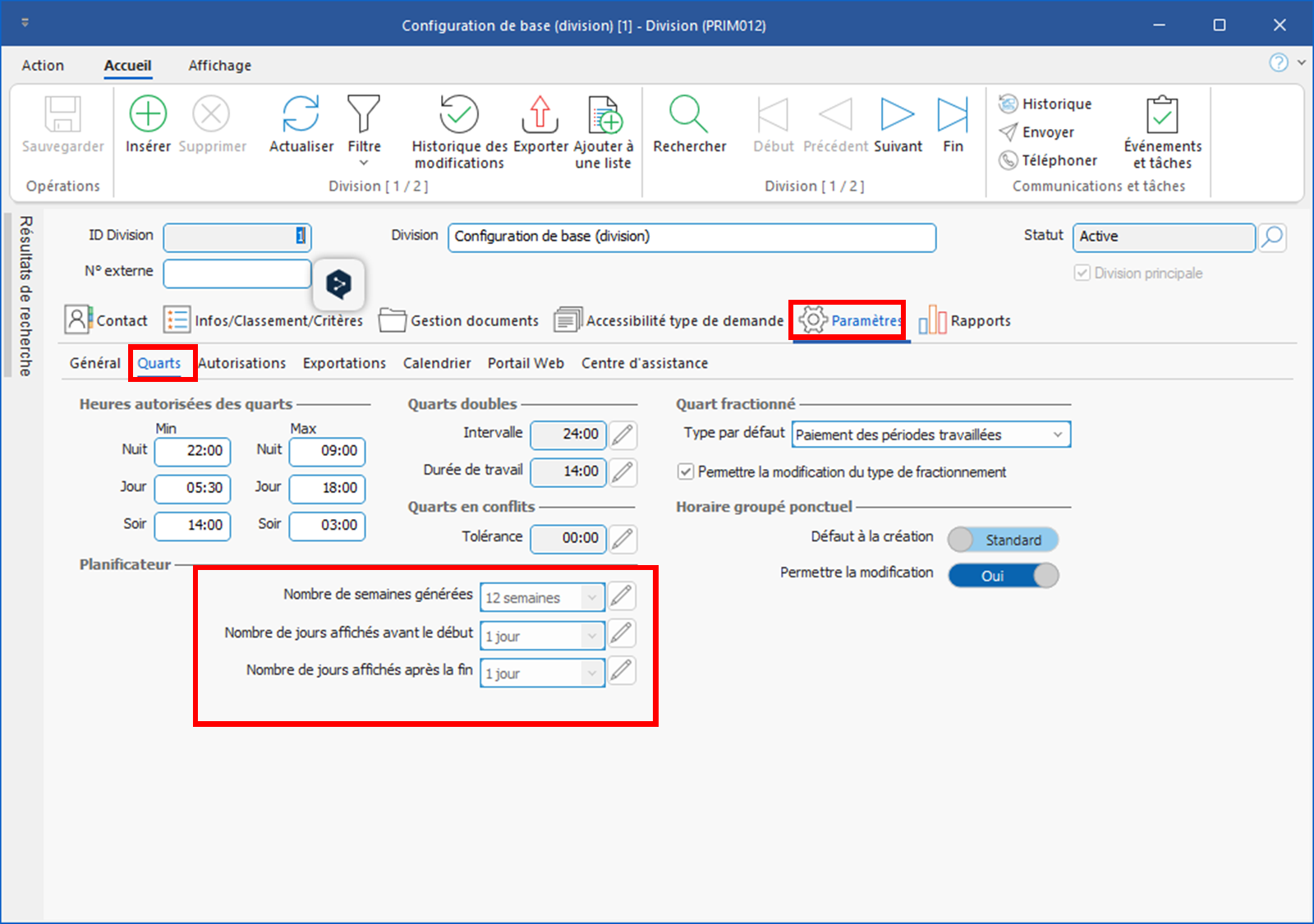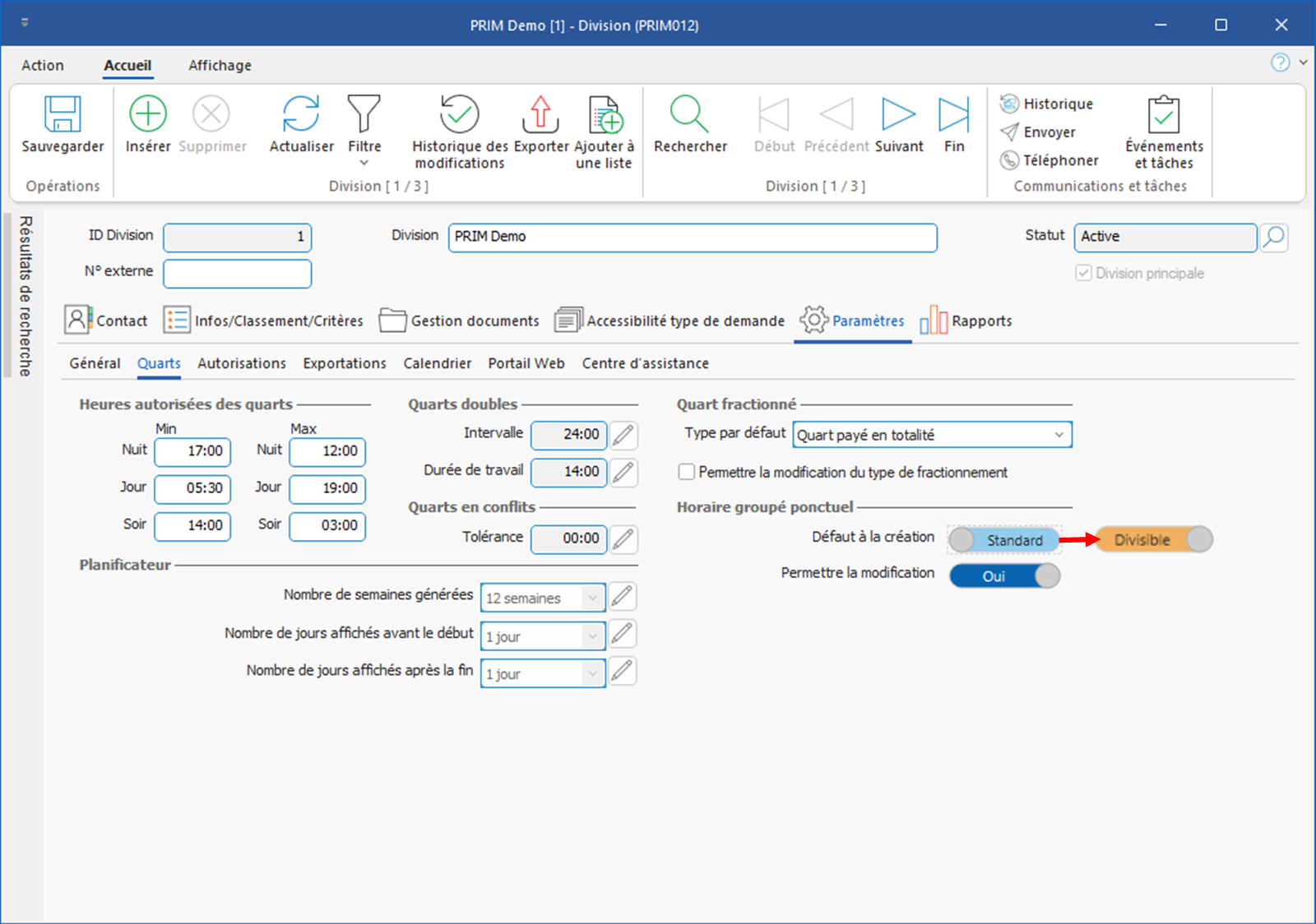Action client : Activer le paramètre dans la division si on veut permettre ce type d'horaire ou le configurer par défaut. (Voir image)