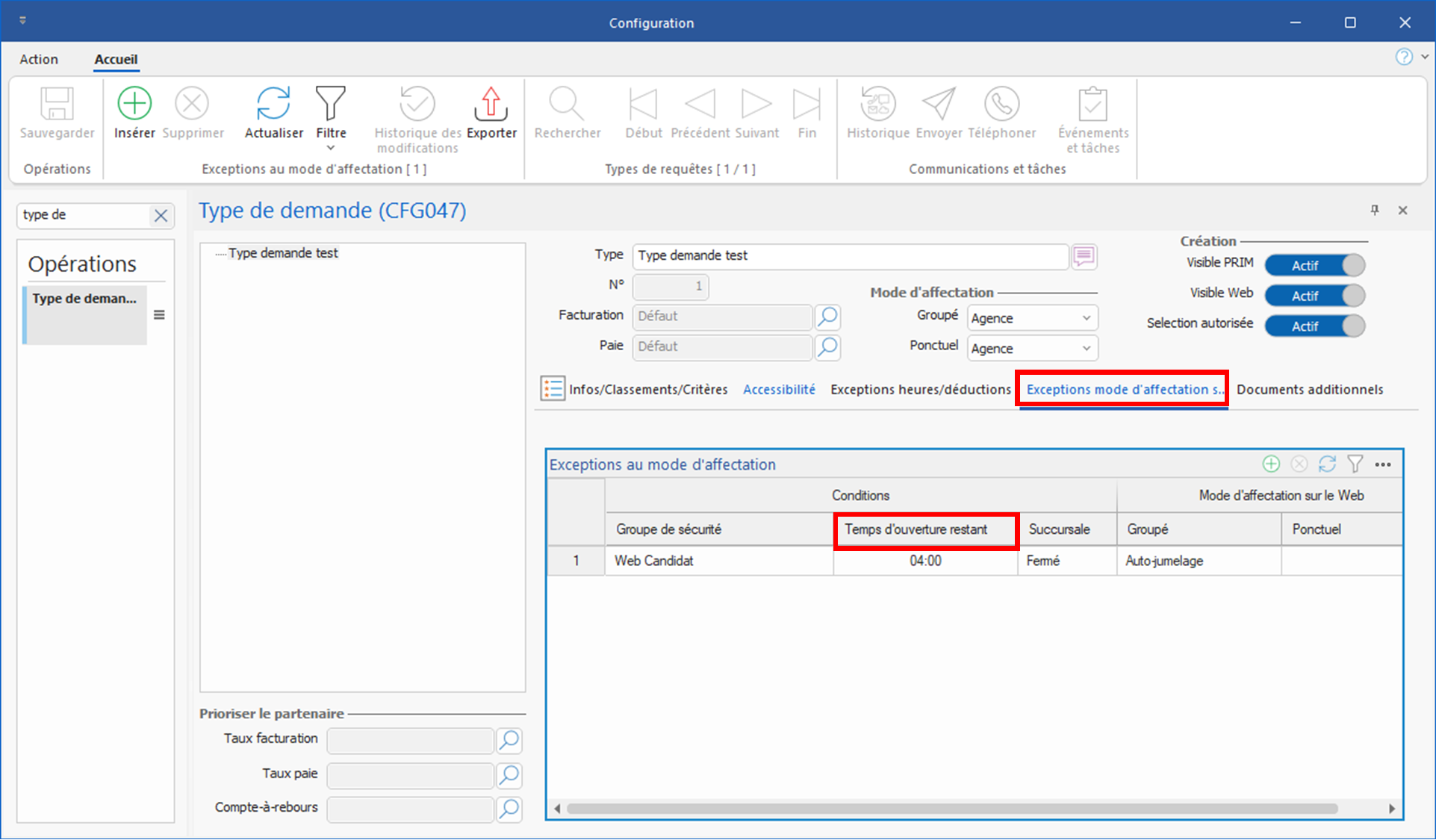 25.Types de demande - modes d'affectation et exceptions : Dans les exceptions au mode d'affectation sur le Web, le calcul effectué par l'option Temps restant avant le début a été modifié pour tenir compte uniquement des heures d'ouverture de l'agence. Le libellé a également été corrigé et indique maintenant Temps d'ouverture restant afin de refléter cette nouvelle réalité. Ainsi, le calcul effectué selon la valeur indiquée dans ce champ tiendra compte des heures d'affaires de l'agence. (Voir image)