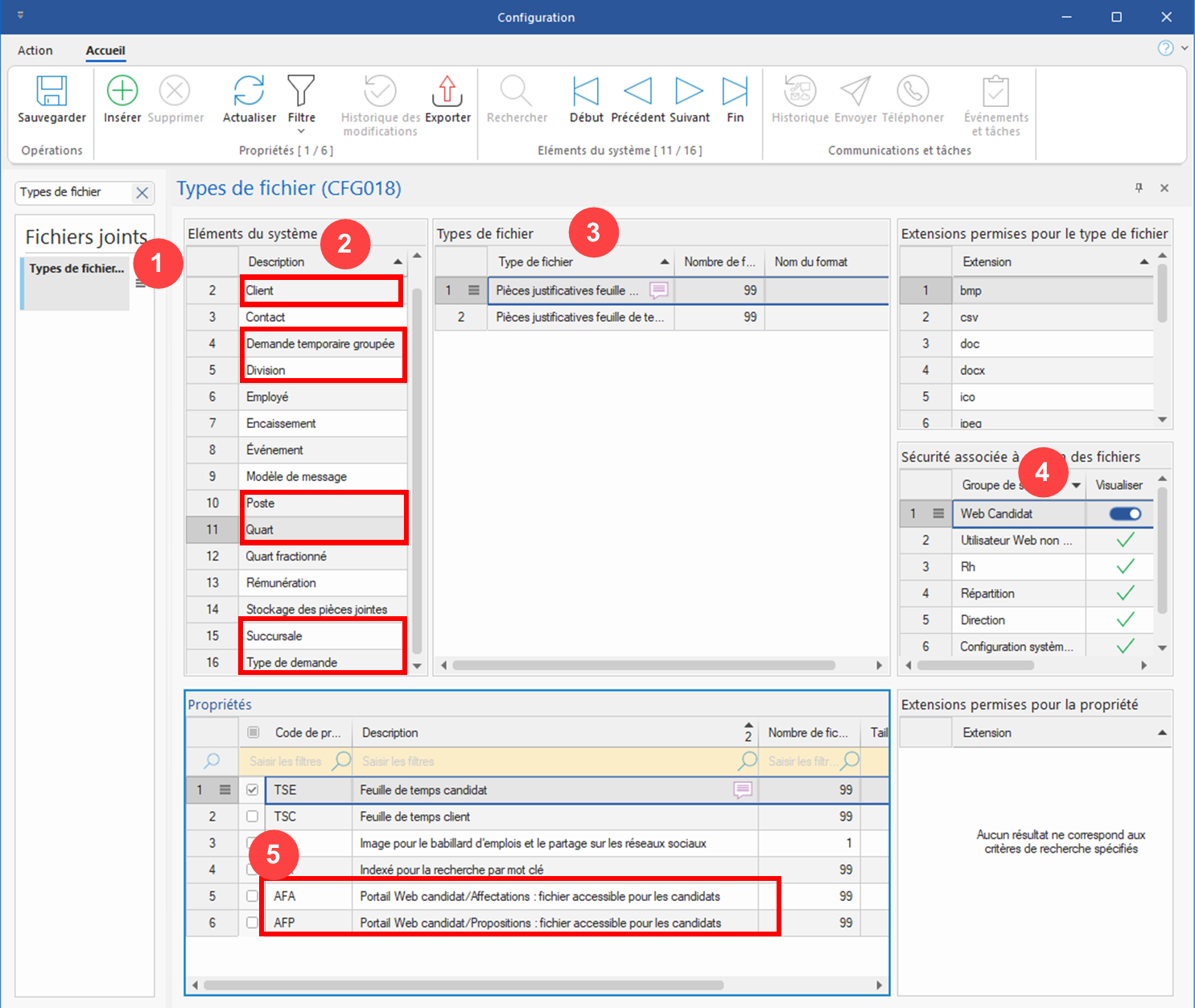 - | Configurer l'accès aux fichiers : Dans le volet « Types de fichier » de la fenêtre de configuration (1), pour chaque entité concernée (2), dans les dossiers prévus pour contenir ces fichiers (3), précisez les groupes de sécurité Web (4) autorisés à accéder aux fichiers d'un dossier spécifique, soit Web Candidat, ou tout autre groupe de sécurité Web pour vos candidats. Enfin, sélectionner les propriétés d'affichage des documents sur le Web (5) dans ces dossiers : cela permettra de cocher ces propriétés sur les documents qui y sont ajoutés. (Voir image) |