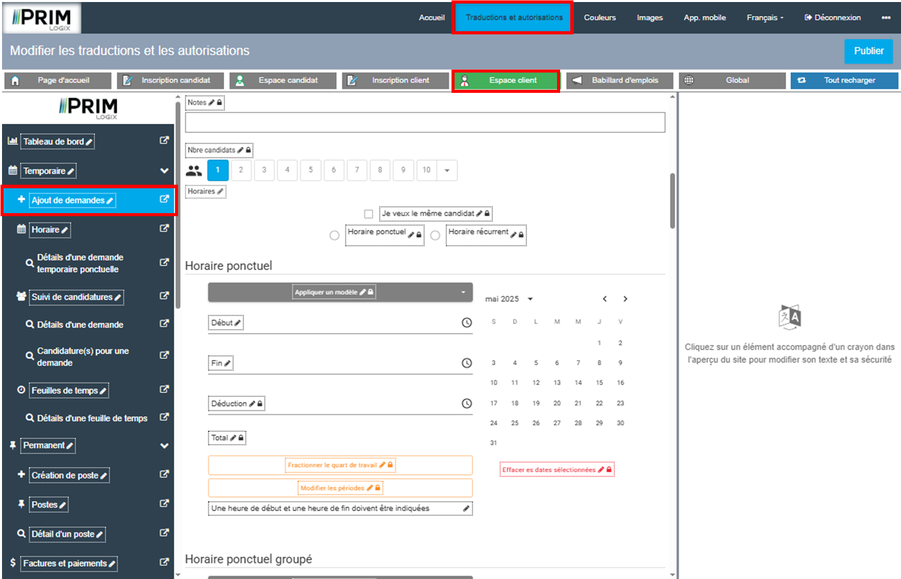 Action client : Au besoin, revoir les libellés de ces différentes pages dans le backoffice.