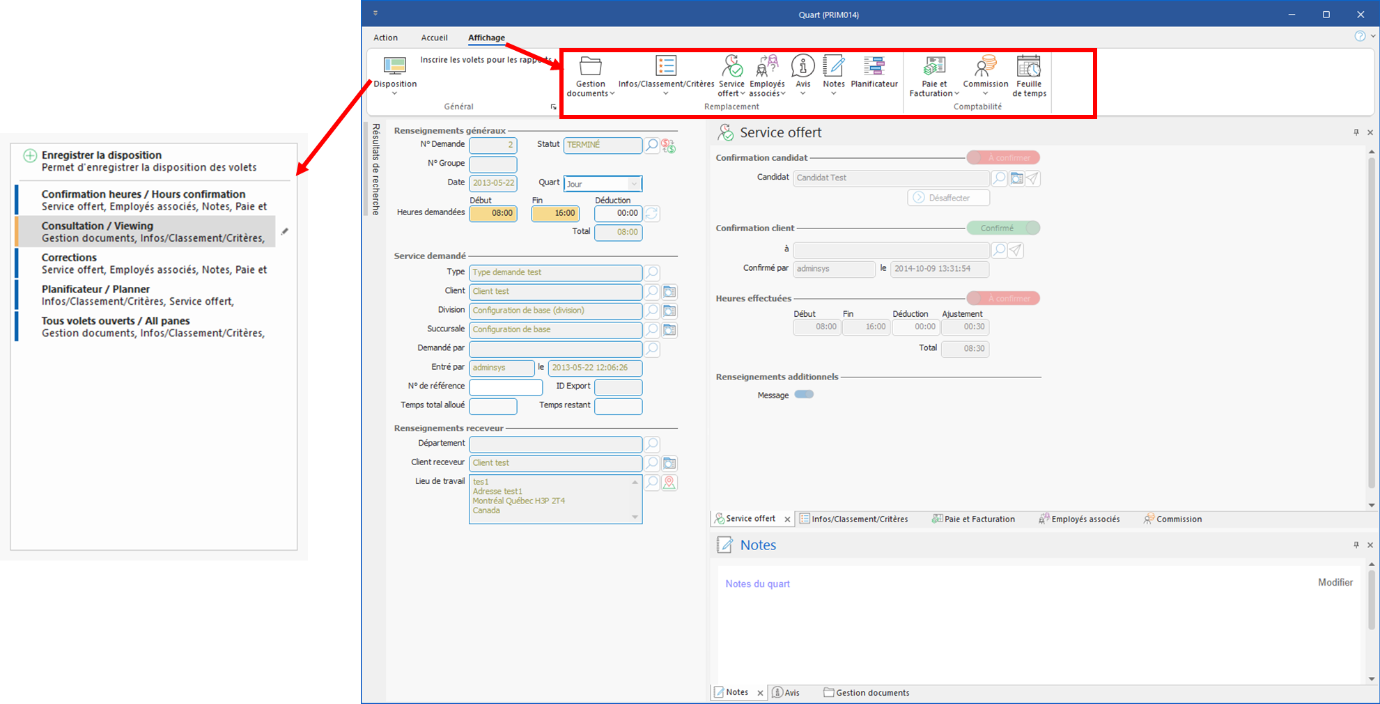 4.Fenêtre Gestion des quarts (PRIM007) : Les onglets Notes, Avis et Lieu de travail ont été transformés en volets mobiles, que l'utilisateur peut ouvrir ou fermer et disposer comme il veut dans la fenêtre.
