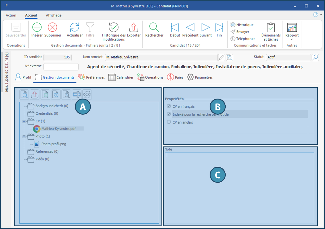 L'onglet « Gestion documents » regroupe tous les documents pertinents à joindre au dossier du candidat. Par exemple, un curriculum vitæ ou une photo.