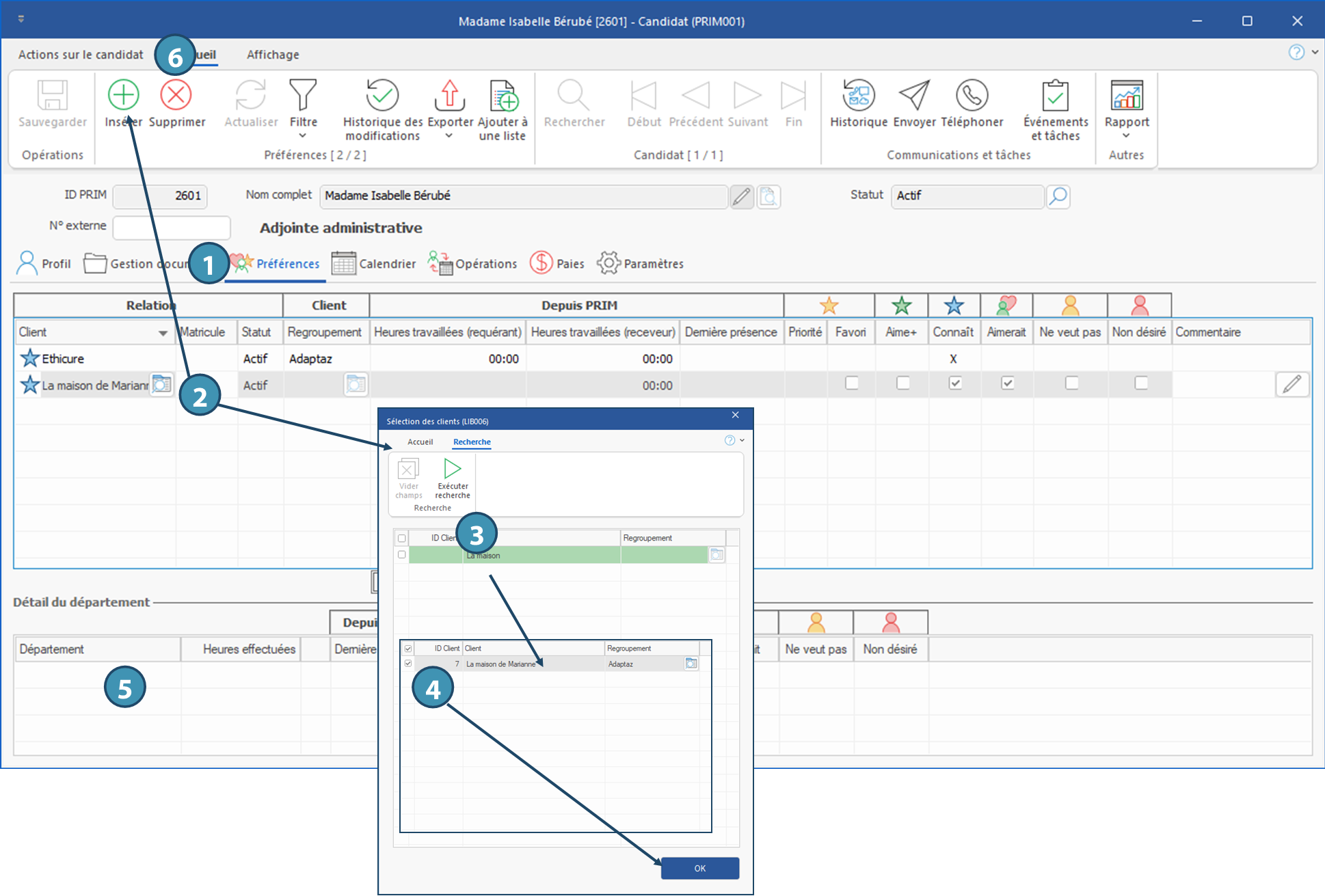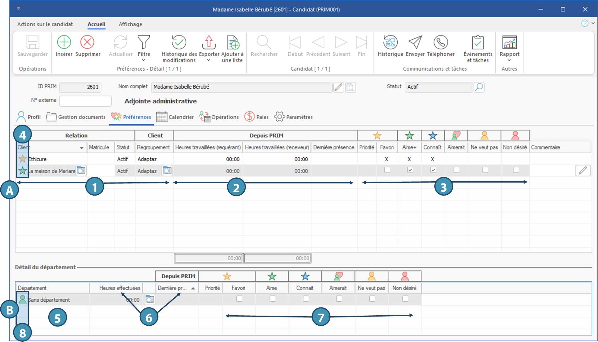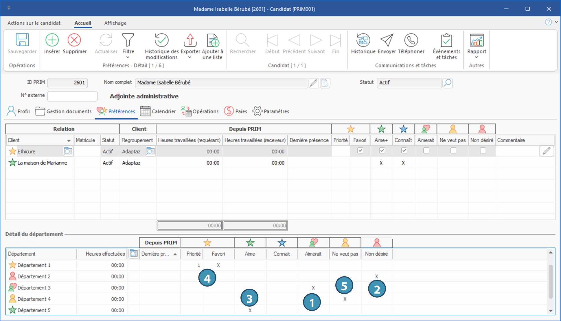 Cet onglet comporte deux zones, soit la zone principale, où sont indiquées les préférences générales qualifiant la relation entre les clients et le candidat, et la zone Détail du département pour les préférences par département, s'il y a lieu.