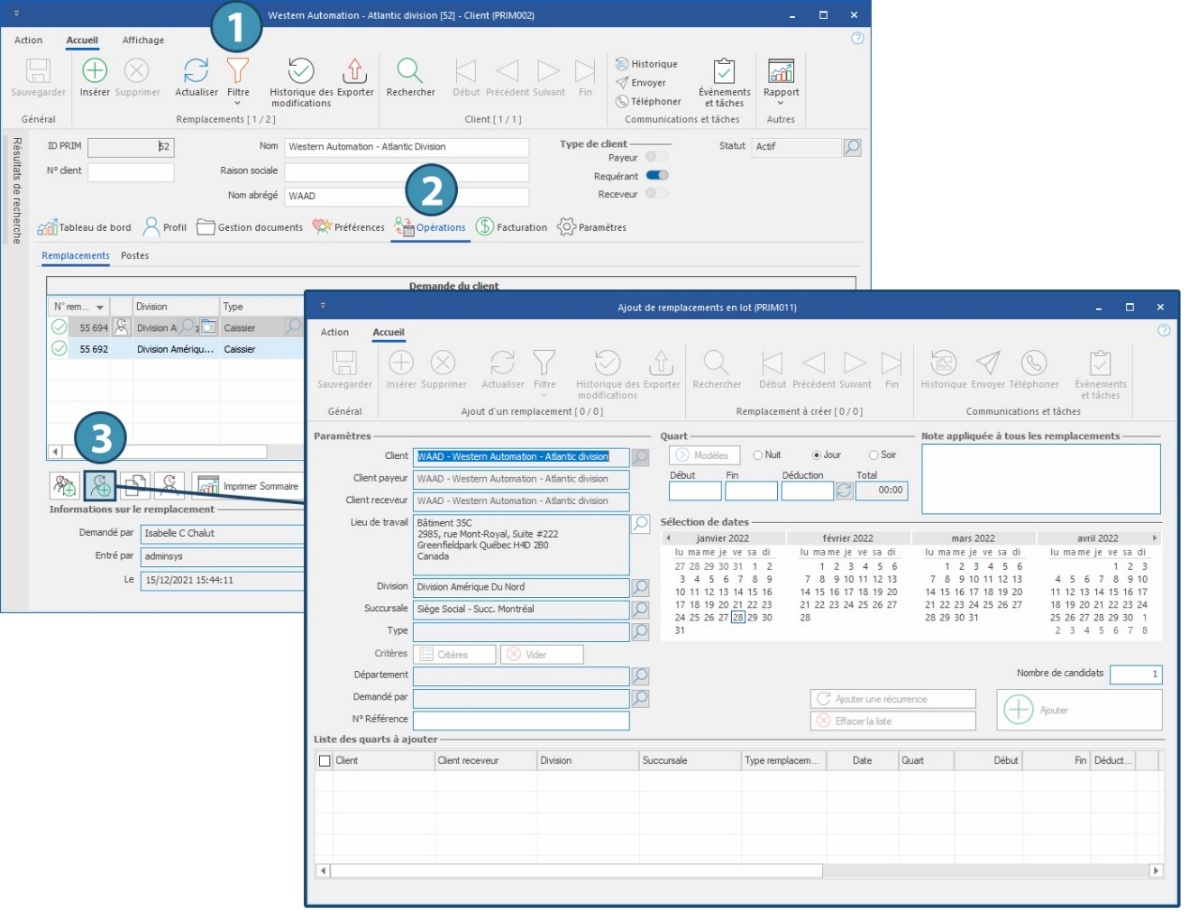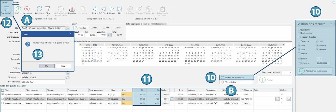 Les quarts sont créés depuis la fenêtre Ajout de quarts en lot (PRIM011).