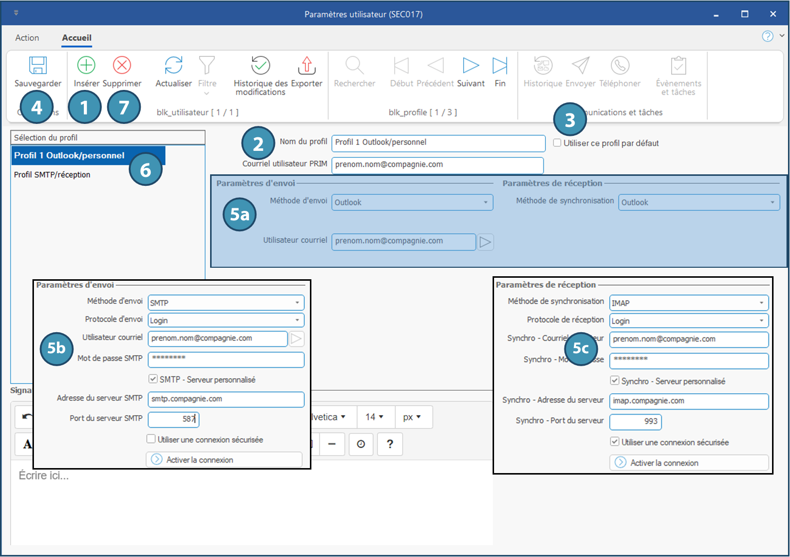 5.L'accès aux paramètres d'envoi et de réception s'active après la sauvegarde du profil. Sélectionnez la méthode d'envoi et la méthode de synchronisation appropriées. Des champs s'ajouteront selon la méthode d'envoi ou de réception sélectionnée, soit l'utilisation de Outlook (5a), ou les méthodes d'envoi SMTP (5b) ou de réception et synchronisation IMAP ou Pop3 (5c).