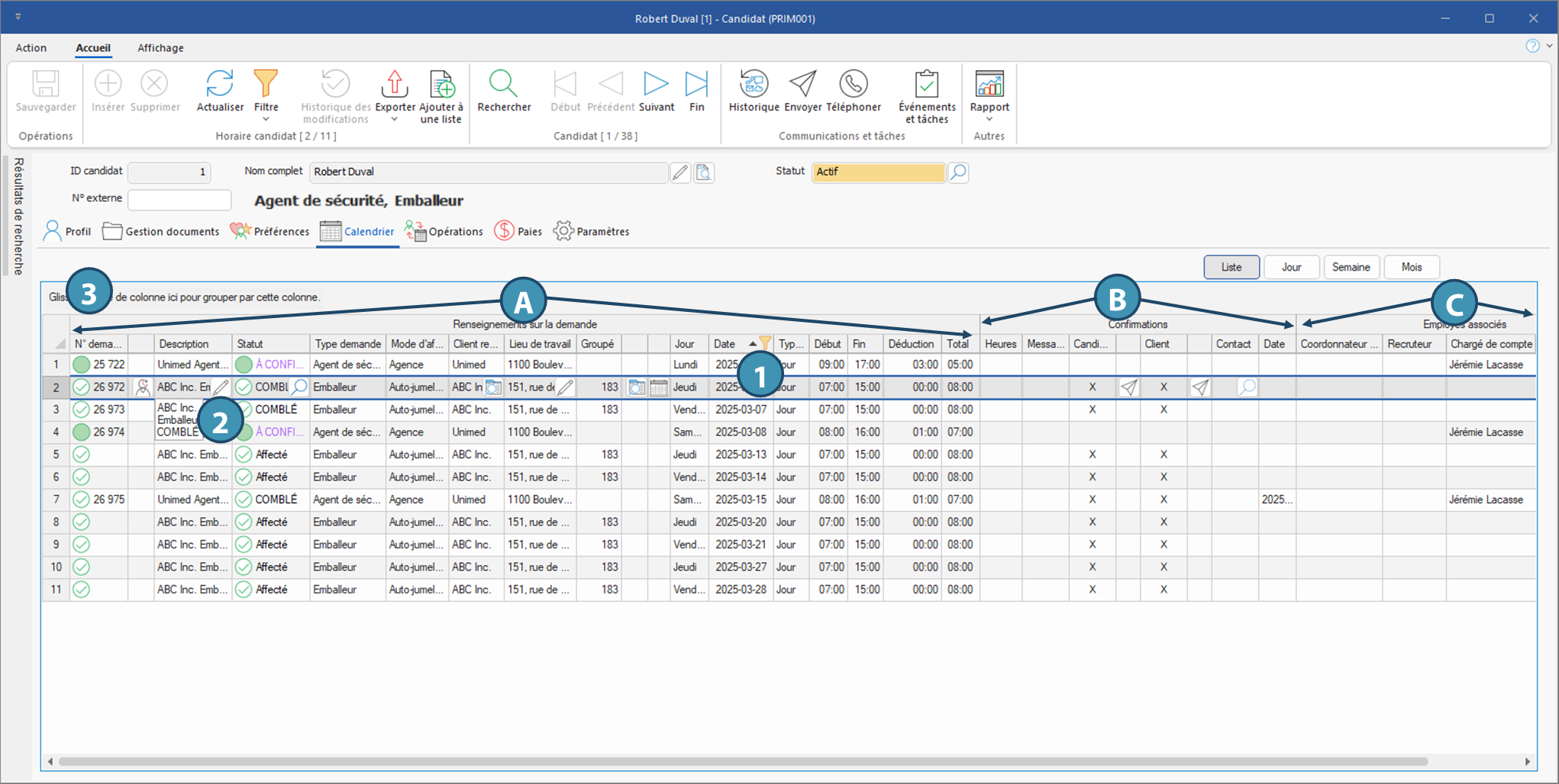 Dans l'exemple ci-dessous, nous avons un candidat qui peut occuper les fonctions Emballeur et Agent de sécurité, et nous avons donc regroupé les affectations en utilisant d'abord le Type de demande, puis le Client receveur.