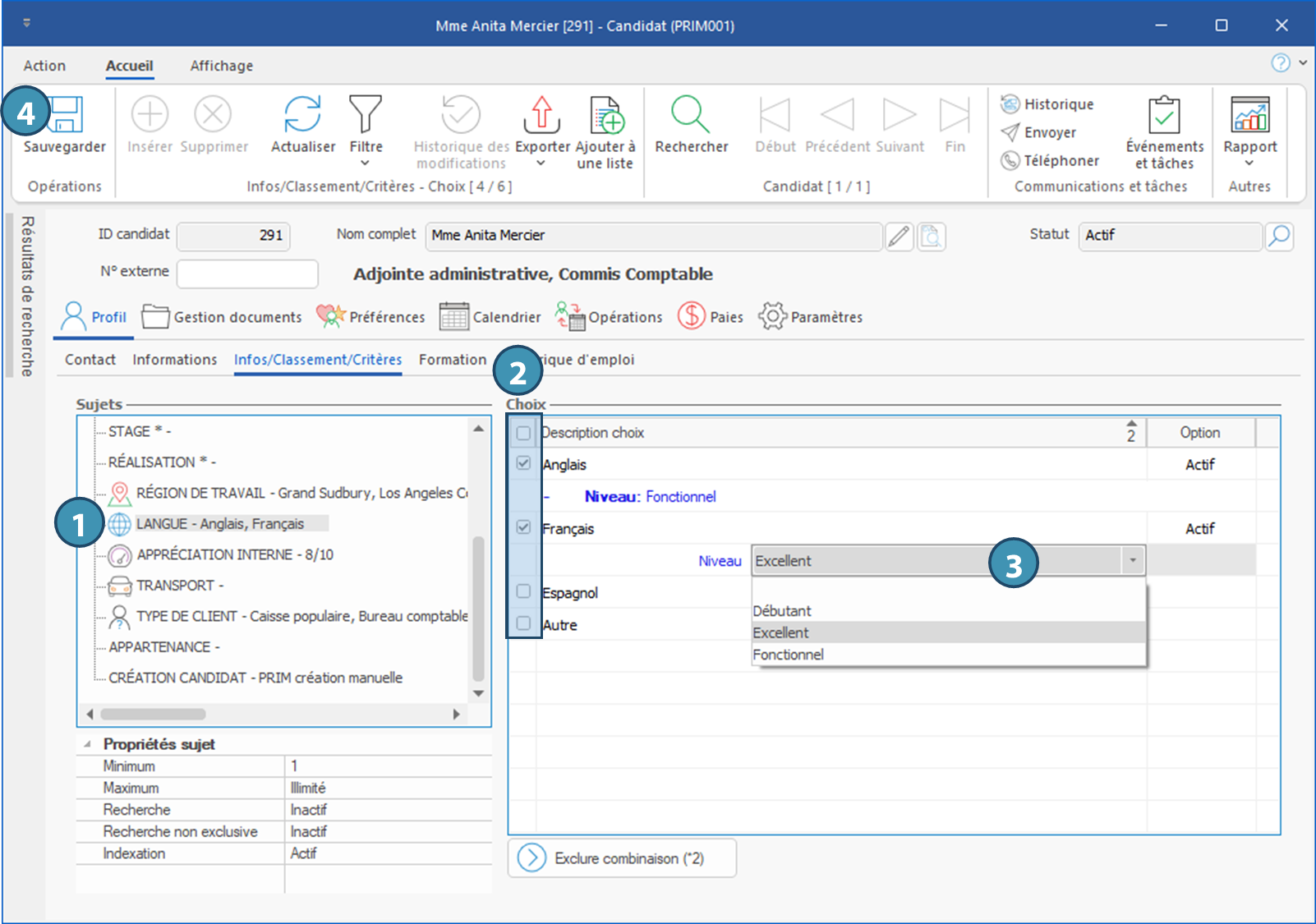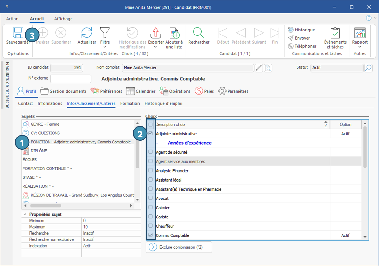 Minimum : Indique le nombre de choix minimum à cocher Maximum : Indique le nombre de choix maximum à cocher Recherche : Sans objet chez le candidat. Cette propriété pourra être activée dans les clients ou les demandes Recherche non exclusive : Sans objet chez le candidat. Cette propriété pourra être activée dans les clients ou les demandes Indexation : Si l'indexaction est activée sur un sujet chez le candidat, cela signifie que le critère peut être utilisé pour la mise en correspondance avec les demandes des clients. À cette fin, le même sujet devra être disponible et activé en recherche chez les clients ou dans les demandes.