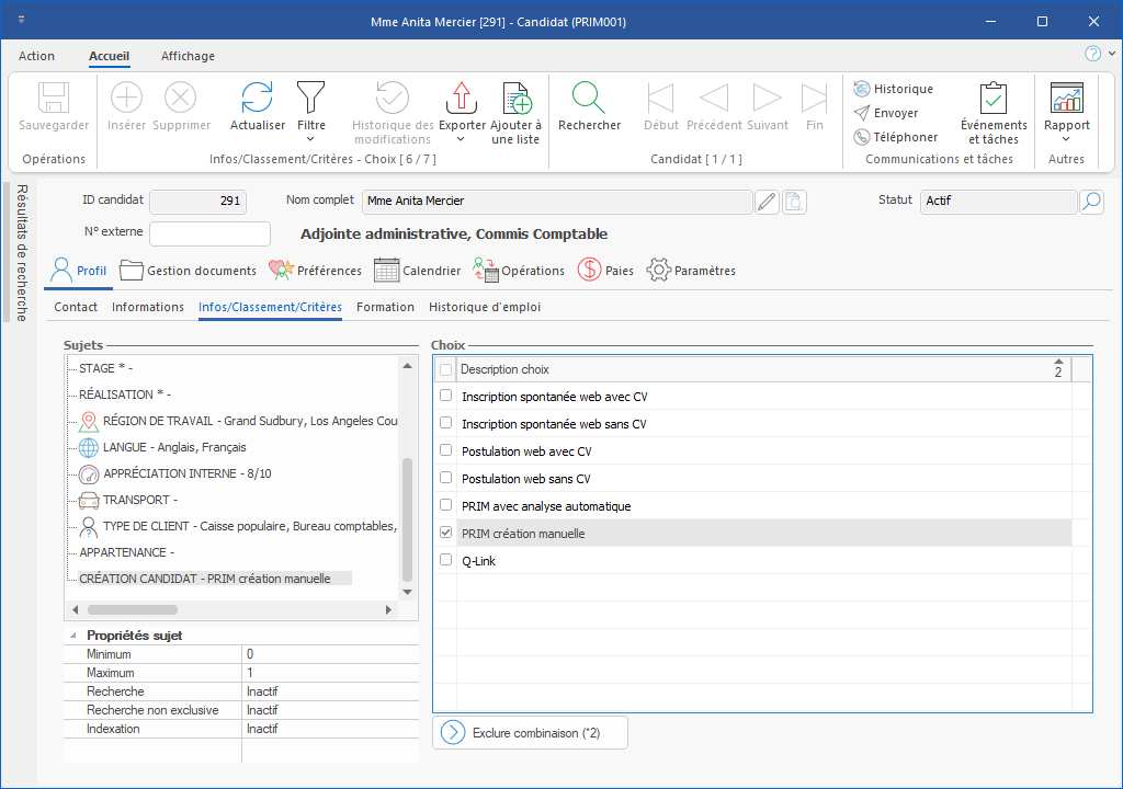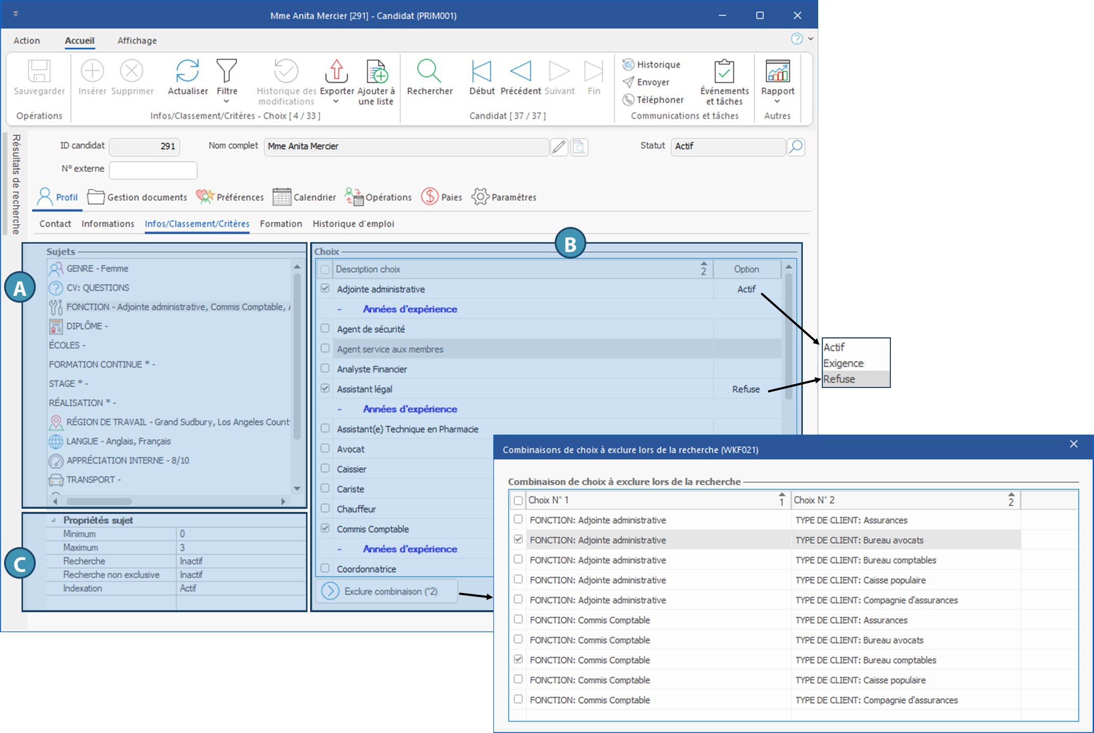 Choix (C)Chaque sujet est associé à une liste de choix ou d'options, et des précisions peuvent parfois être apportées à ces choix ou options, selon le cas. Par exemple, pour un sujet comme Permis professionnel, les choix pourraient correspondre aux types de permis, et un champ à remplir peut être configuré pour permettre l'ajout du numéro de permis, la date d'expiration, etc. Enfin, pour des critères utilisés dans la correspondance avec les offres d'emploi ou les clients, les choix peuvent être qualifiés de la façon suivante : Actif : Option sélectionnée par défaut. Le candidat s'affichera dans le planificateur pour les demandes qui correspondent, à condition que les autres critères soient également satisfaits. Exigence : Le candidat s'affichera dans le planificateur seulement pour les demandes correspondant exactement à cette option. Si une option cochée est associée à cette option, cela exclura toutes les autres options cochées pour le même sujet, même si le candidat a les compétences requises. Refuse : Le candidat refuse les offres correspondant à cette option. Ainsi, si cette option est sélectionnée pour un choix coché, cela signifie que le candidat a les compétences, mais refuse ce type de mandat. Le candidat n'aparraîtra donc pas dans le planificateur pour ce type de mission.