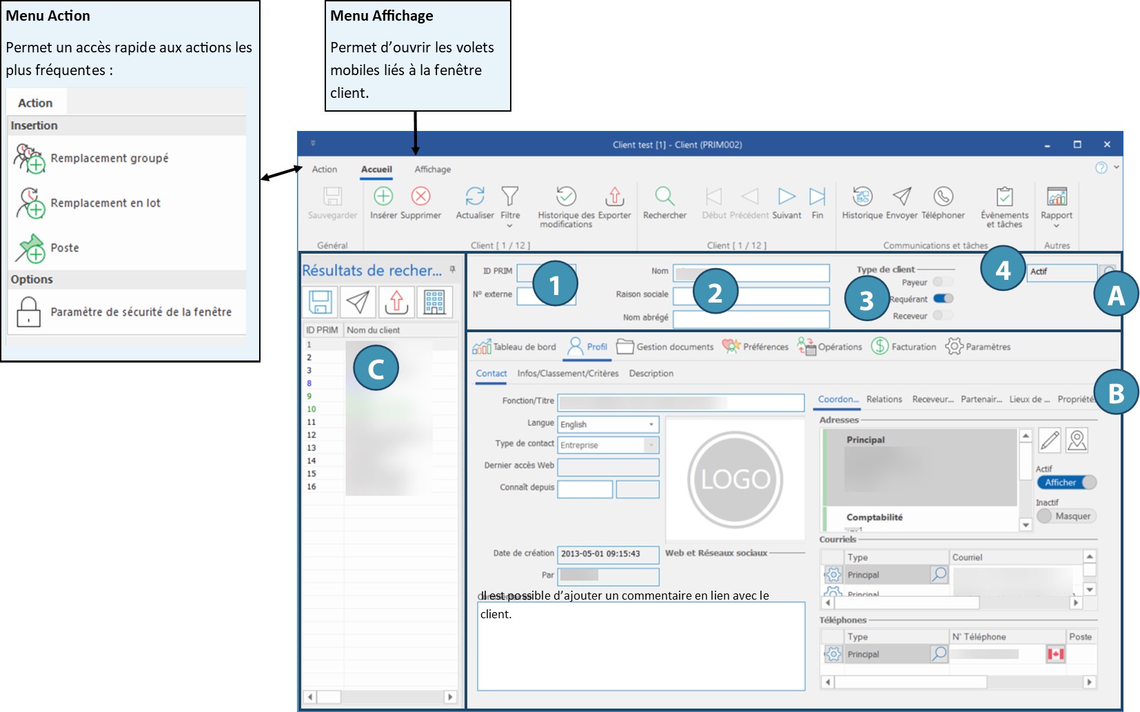La partie du haut présente les renseignements de base sur le client, et elle demeure inchangée quel que soit l'onglet sélectionné dans le bas. (A)