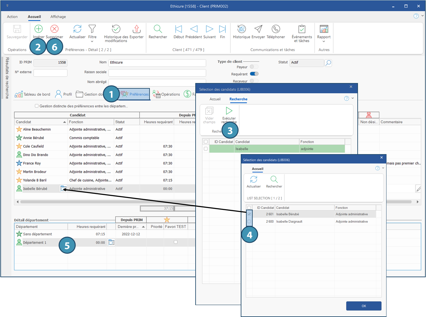 La case « Connaît » est cochée automatiquement dans les dossiers du candidat et du client après la première affectation du candidat chez le client. Il est possible de cocher cette case lors de l'ajout d'un candidat dans la liste des préférences.
