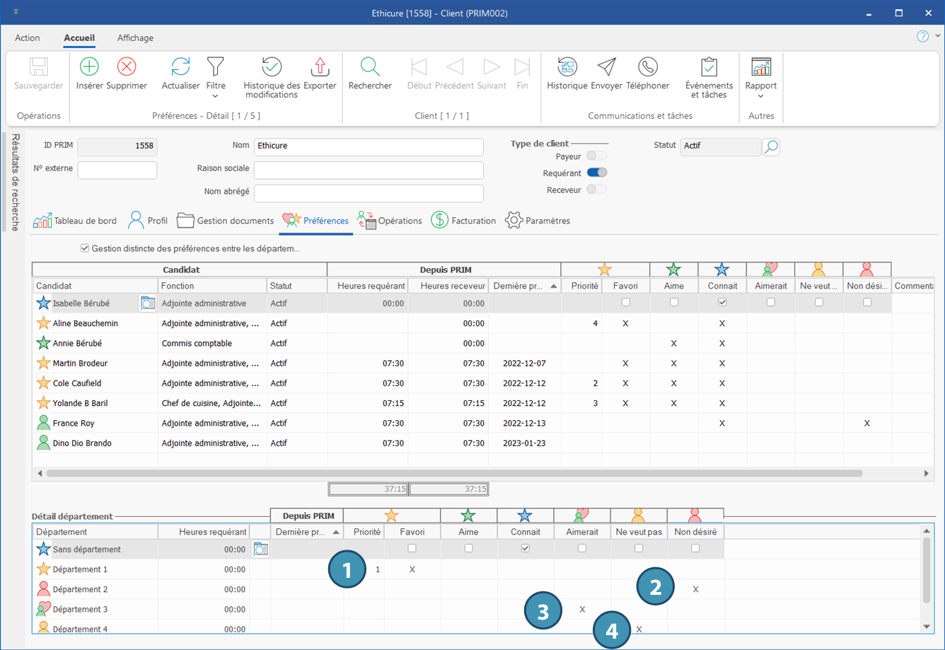 1.Gestion distincte des préférences entre les départements : Si cette case est cochée, les préférences sélectionneées seront gérées selon les départements dans la zone Détail département. Si aucun département n'a été défini pour le client ou pour un quart, le système indiquera Sans département.