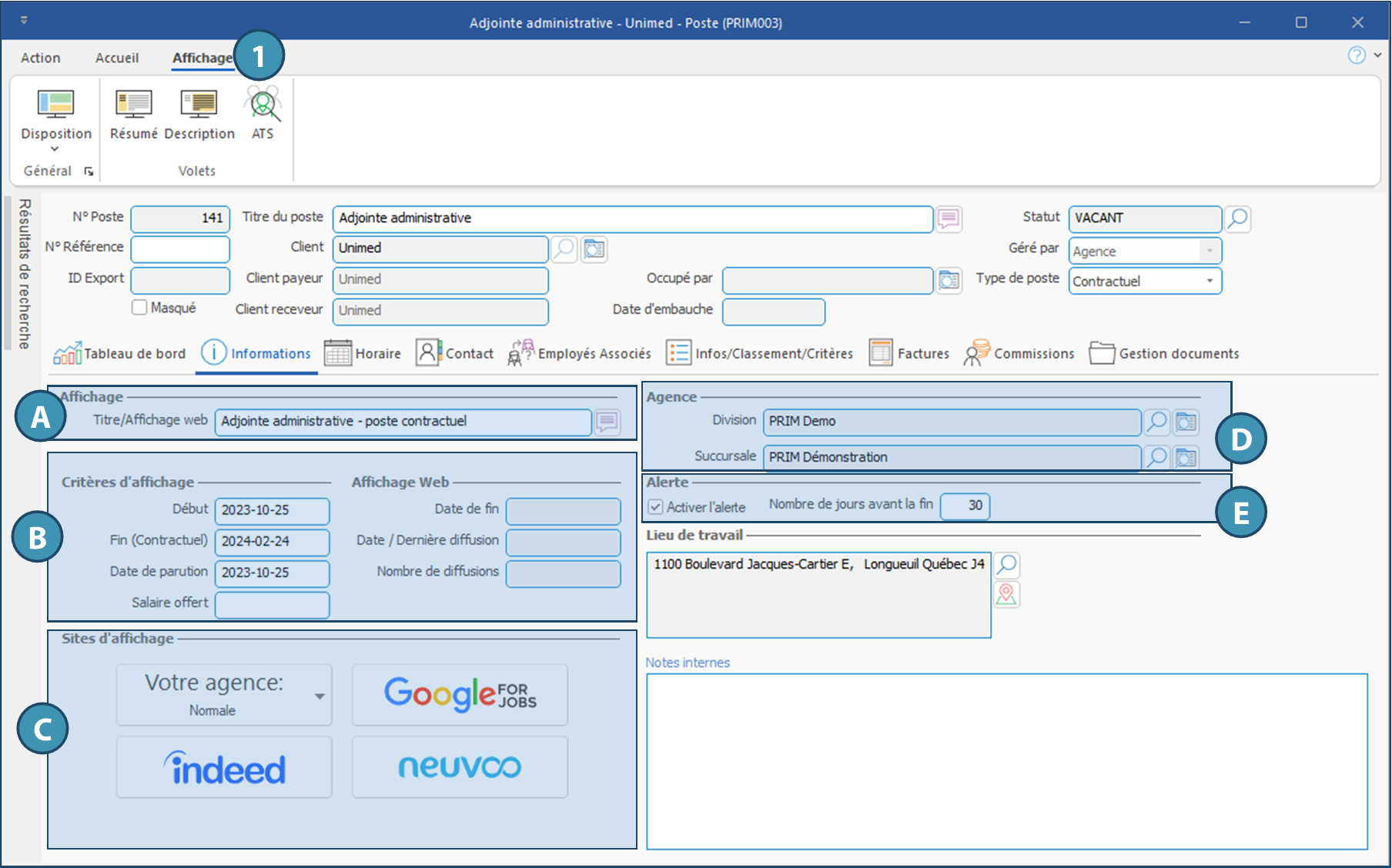 Le résumé et la description complète du poste tels qu'ils seront affichés sur les sites d'emplois se font dans les volets « Résumé » et « Description », accessible depuis le ruban « Affichage » de la fenêtre (1).