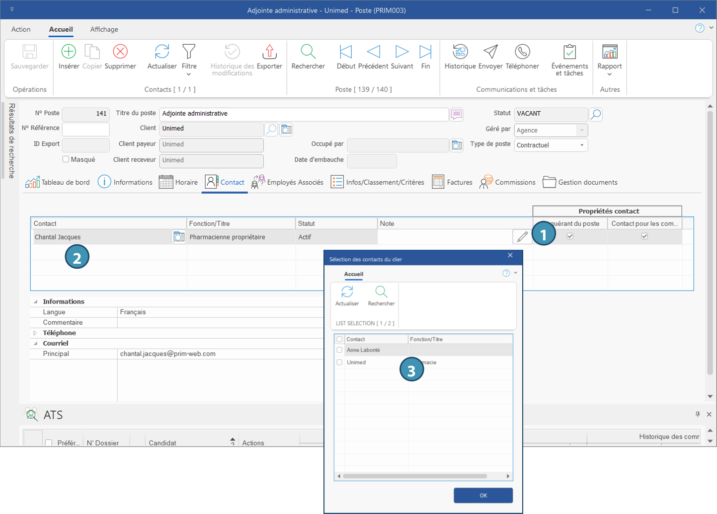 L'onglet « Contact » permet d’accéder rapidement aux coordonnées des personnes à contacter en lien avec le poste.