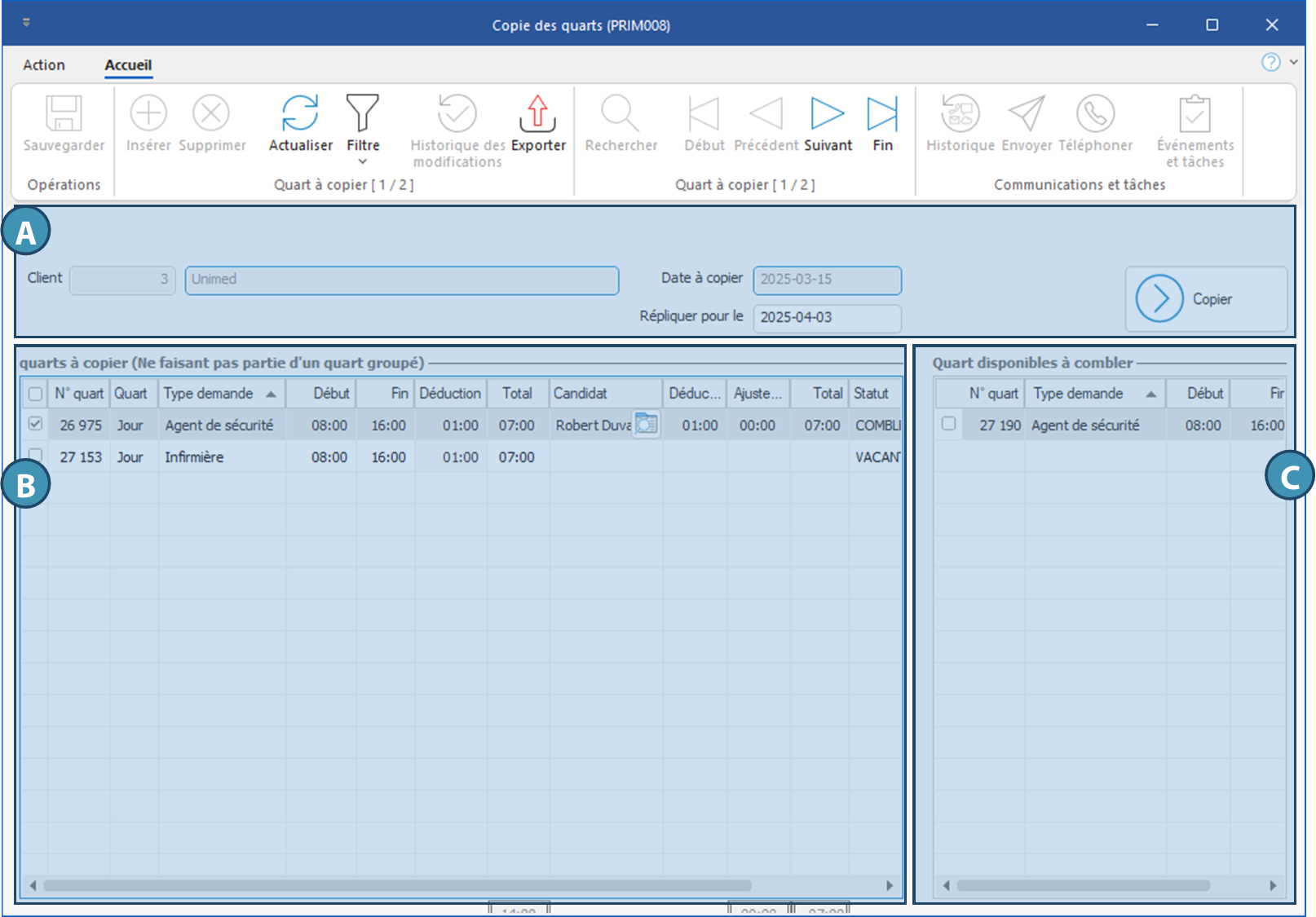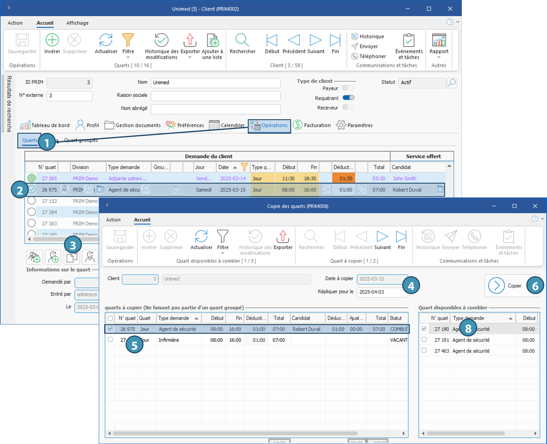 La copie de quart est possible depuis la fenêtre « Gestion des quarts » et sous l'onglet « Opérations » de la fenêtre « Client ».
