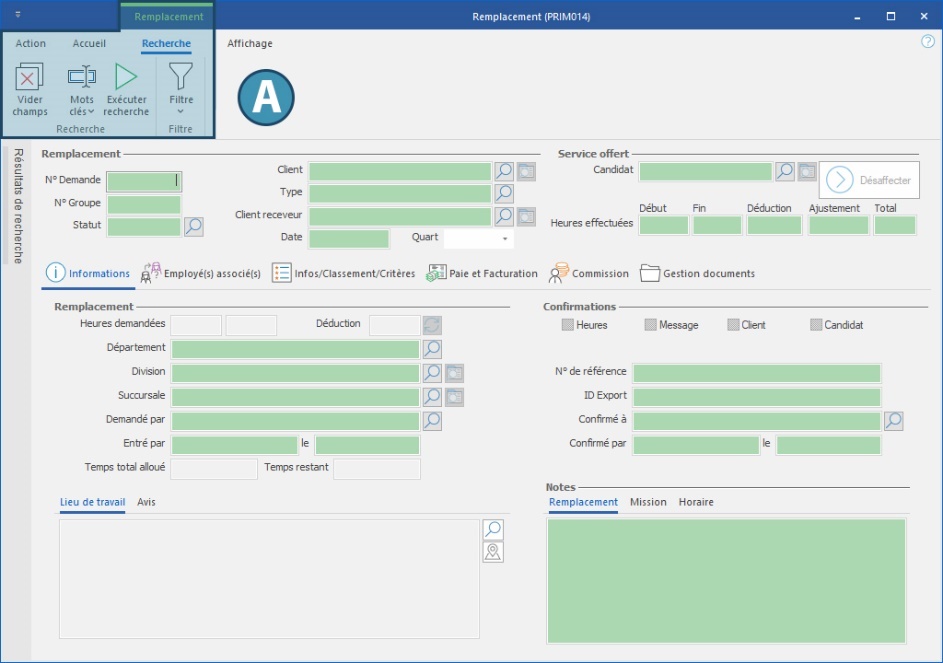 À son ouverture depuis le ruban accueil, la fenêtre s’affiche en mode « Recherche » (A). Toutefois, si vous l’ouvrez à partir du bouton « Détail du quart », la fenêtre affiche directement la demande concernée.