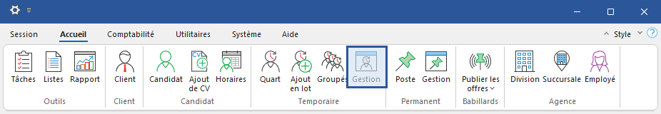 Pour y accéder, à partir du ruban Accueil de PRIM, cliquez sur le bouton Gestion de la section Permanent .