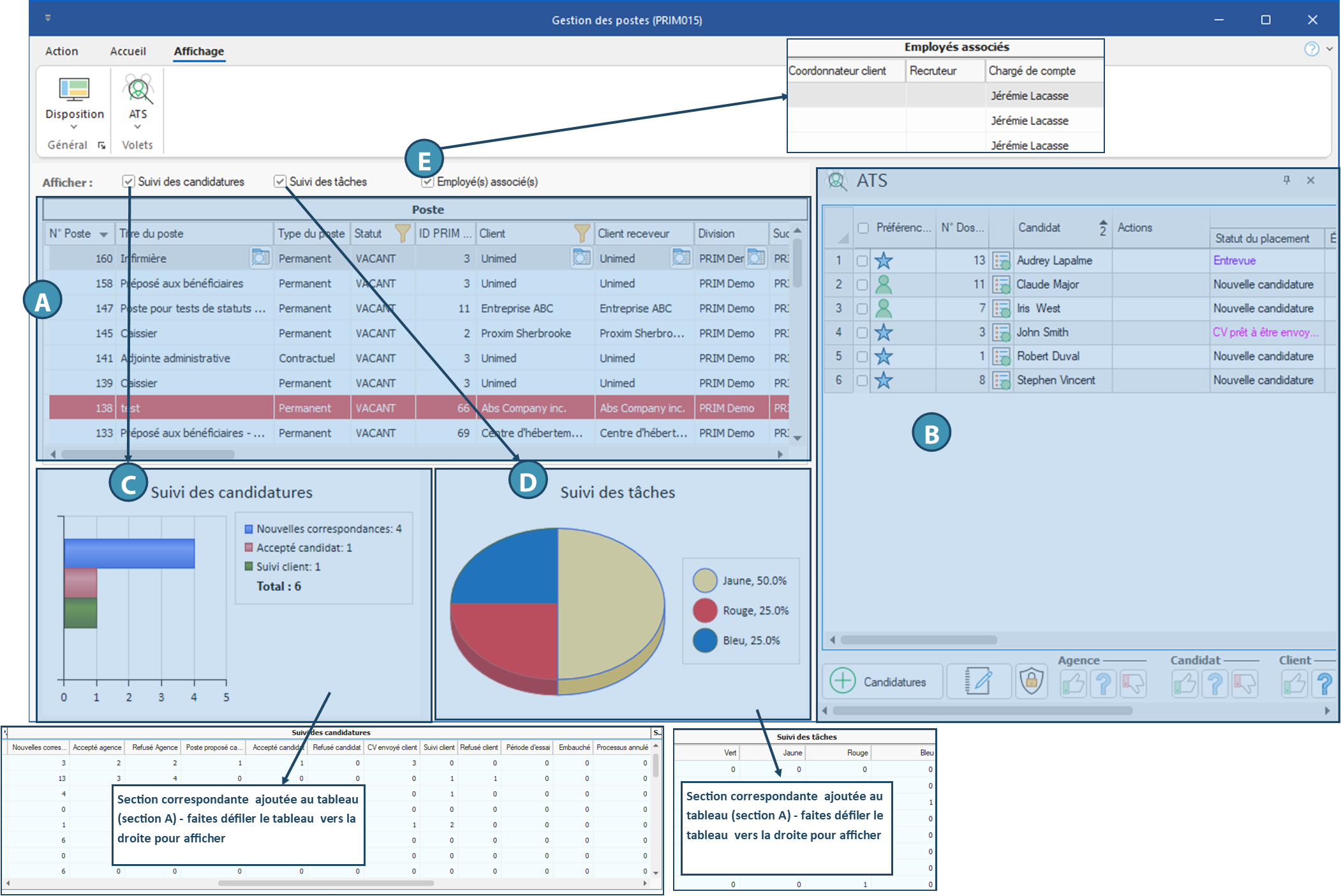 B.Volet ATS : Ce volet mobile peut s'afficher à différents endroits selon votre disposition, et il est possible de le fermer. Le cas échéant, il sera possible de l'afficher de nouveau à partir du ruban Affichage (1). Ce volet est utilisé pour gérer les candidatures et l'ensemble du processus de placement. Pour plus de détails sur l'utilisation de l'ATS, consultez les pages de la section Affecter un candidat et effectuer un suivi des candidatures.