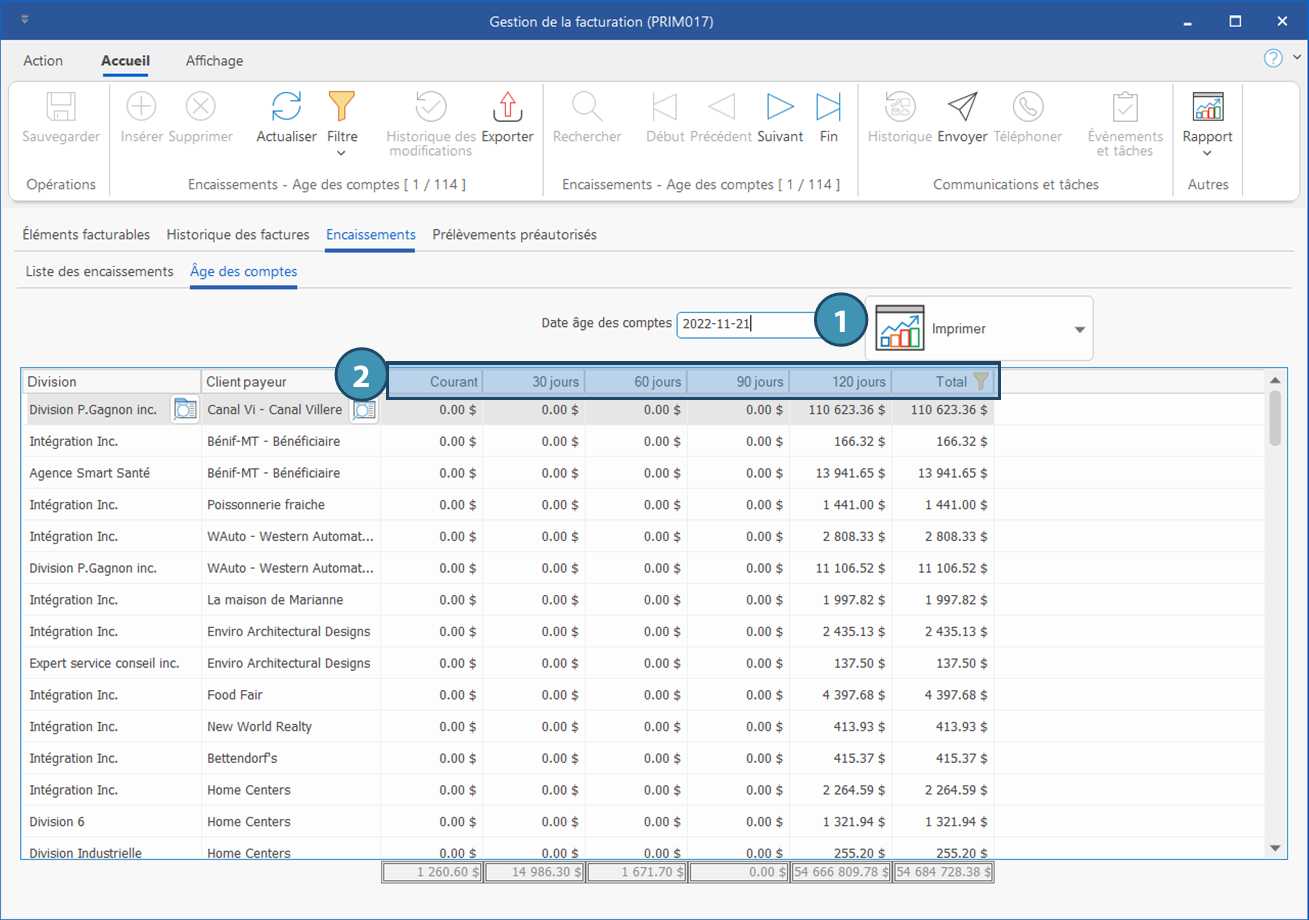 Le sous-onglet « Âge des comptes » vous donne un aperçu des comptes à recevoir selon la date inscrite (1). Il est divisé en 4 tranches (2).