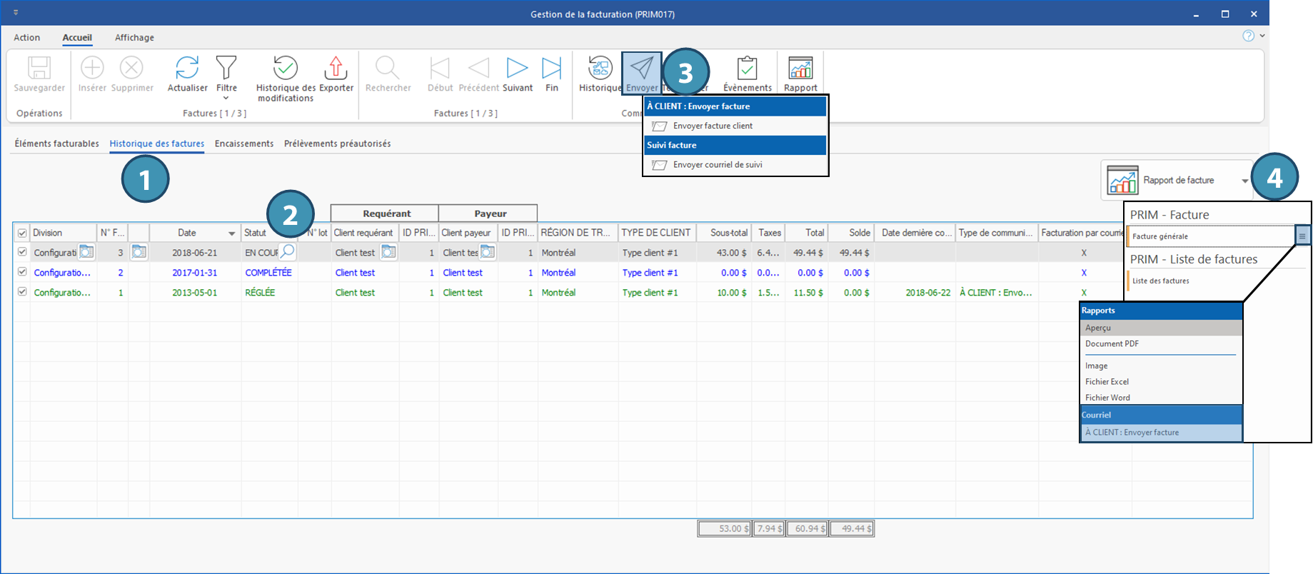 Il est possible d'envoyer les factures à partir de cette fenêtre. Deux méthodes existent selon que l'on souhaite envoyer une ou plusieurs factures : •Envoi d'une seule facture : À partir du ruban Accueil de la fenêtre, cliquez sur le bouton Envoyer (3) et sélectionnez le modèle de courriel Envoyer facture client.